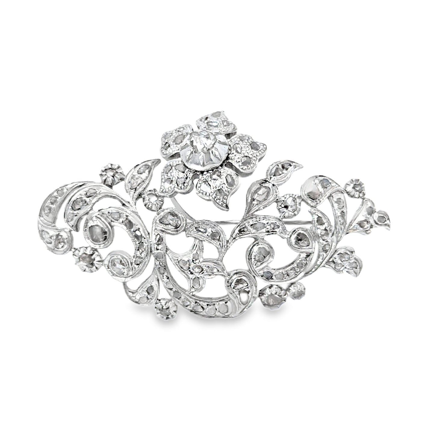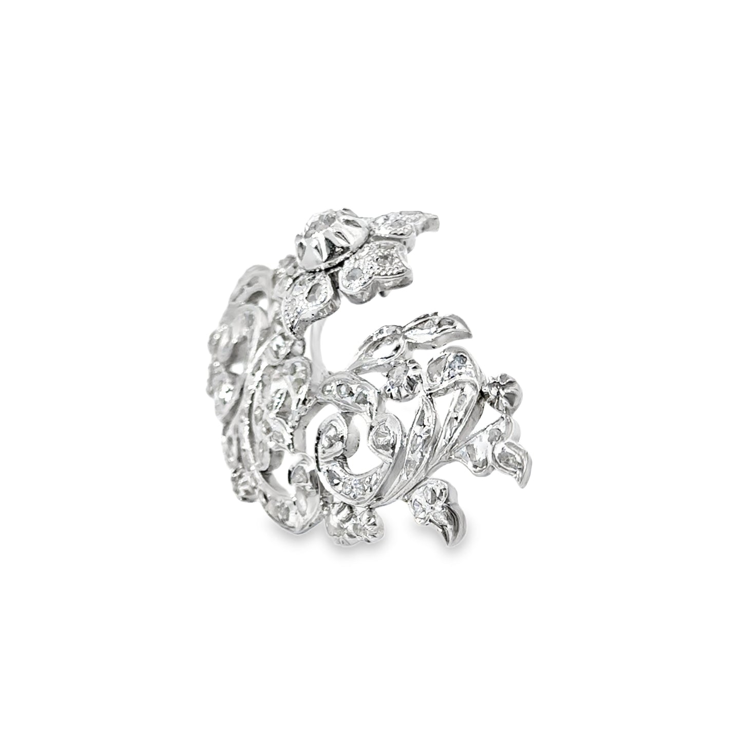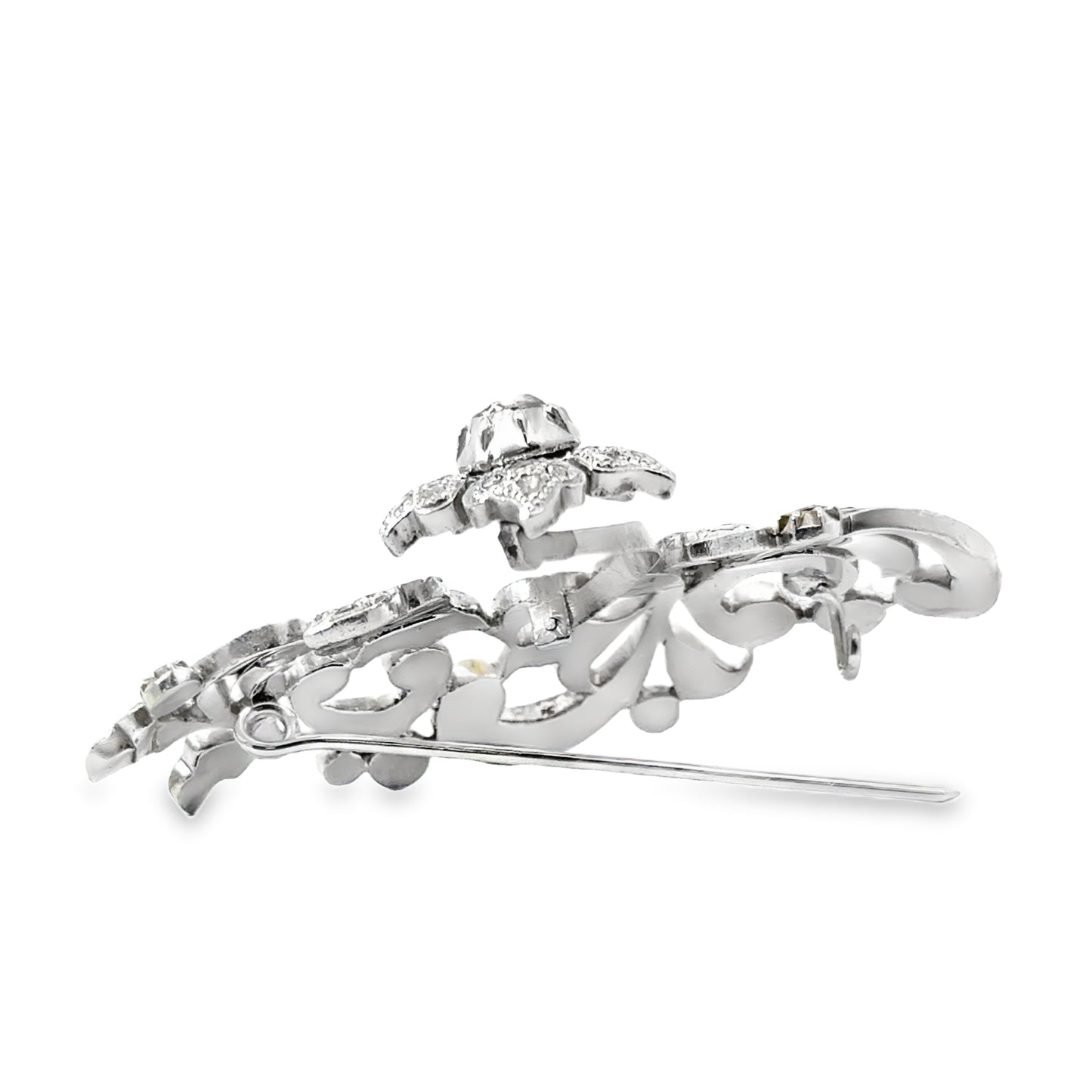 The openwork design enhances the brooch’s lightness and airiness, while the silver setting adds a subtle vintage charm, complementing the brilliance of the diamonds. This piece captures the romantic and delicate aesthetic of the period, making it a timeless accessory for special occasions or a prized addition to a vintage jewelry collection.