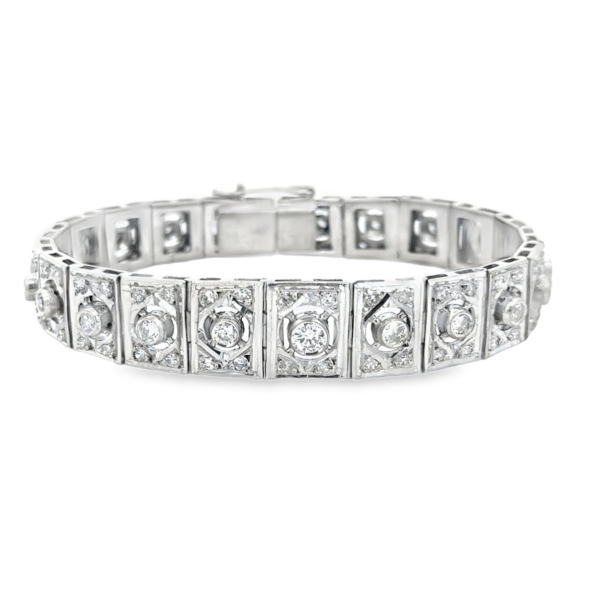 This exquisite Art Deco bracelet from the 1920s showcases the unmistakable geometric elegance and craftsmanship of the era. Hand-constructed in richly polished 18K white gold, the piece features a continuous row of openwork square links, each centered with a sparkling VS-clarity, G-color diamond, framed by intricate milgrain and diamond accents.