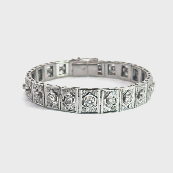 This bracelet is a quintessential example of Art Deco design, characterized by repeating geometric motifs, symmetrical architecture, and crisp metalwork. The bold square links and circular diamond centers reflect the period’s fascination with modernity, movement, and clean lines. A collector-worthy heirloom, this piece transitions beautifully from day to evening and adds timeless glamour to any jewelry wardrobe.