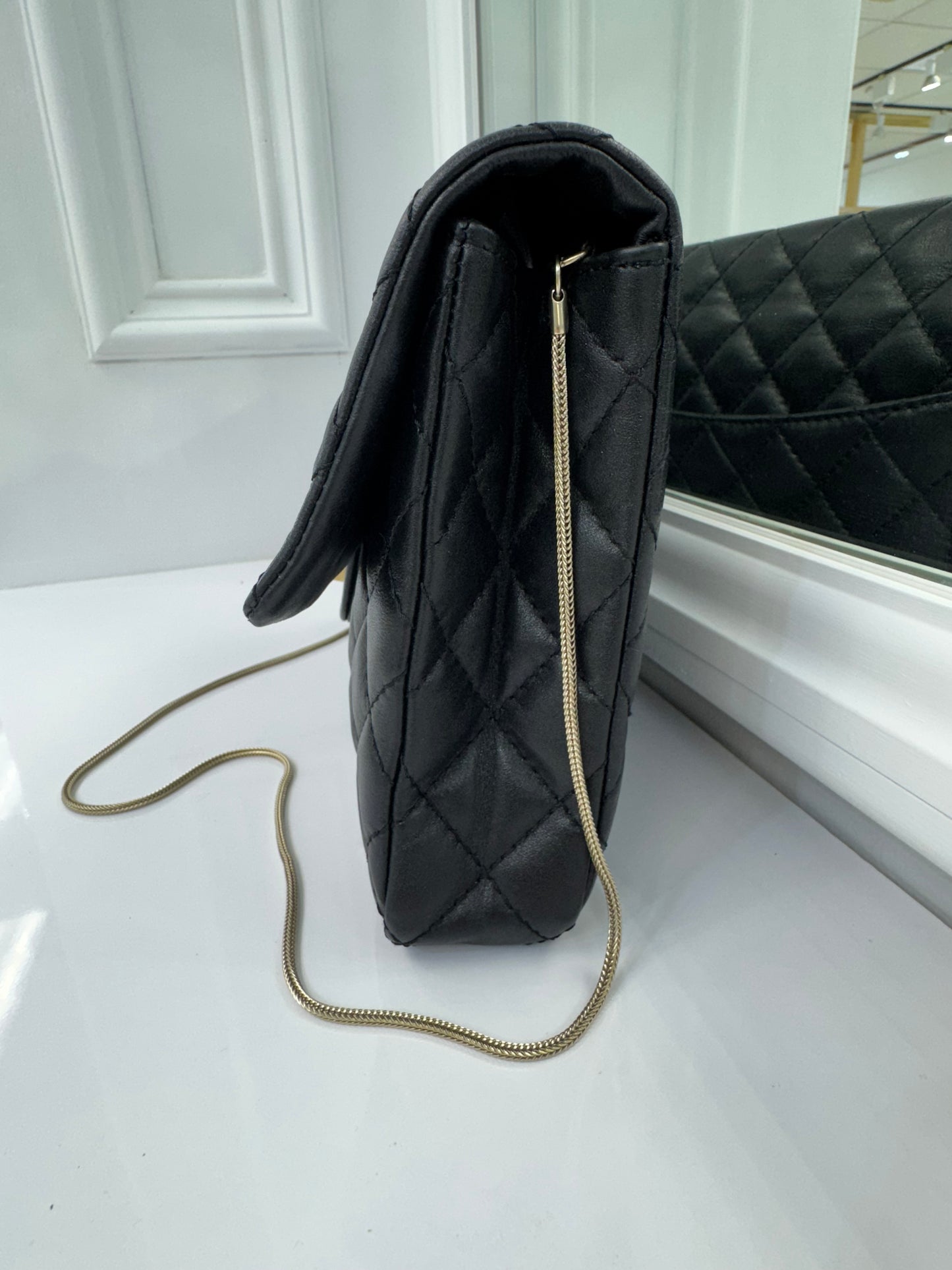 Chanel Reissue 2.55 Flap Bag, crafted in luxurious black quilted lambskin leather and accented with elegant gold-tone hardware. This classic piece features the iconic Mademoiselle turn-lock closure and a sleek gold chain strap that can be worn over the shoulder or crossbody.
