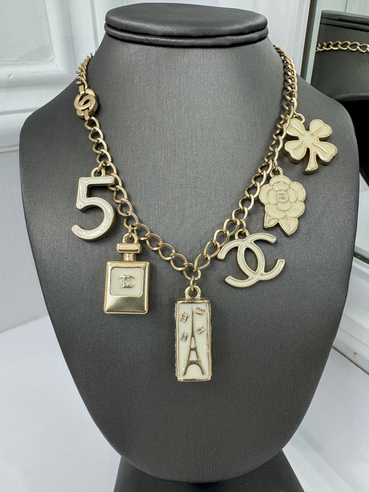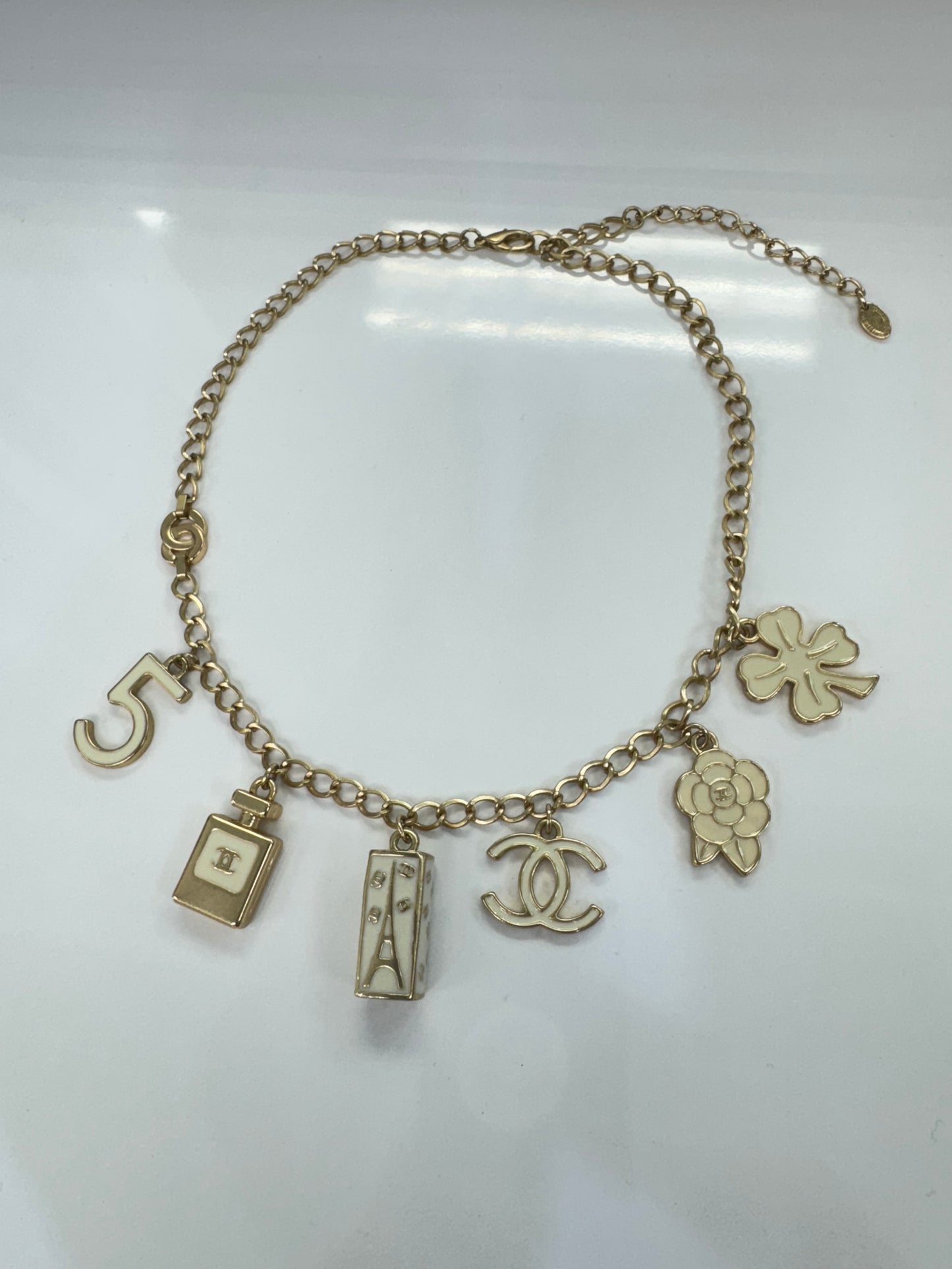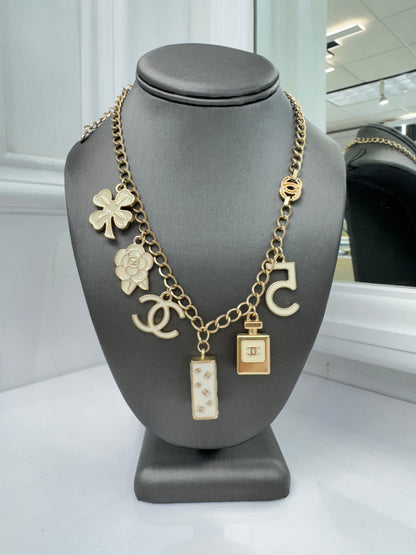 Authentic Chanel Vintage Gold-Tone Charm Necklace with Iconic Motifs in Cream Enamel – Made in France