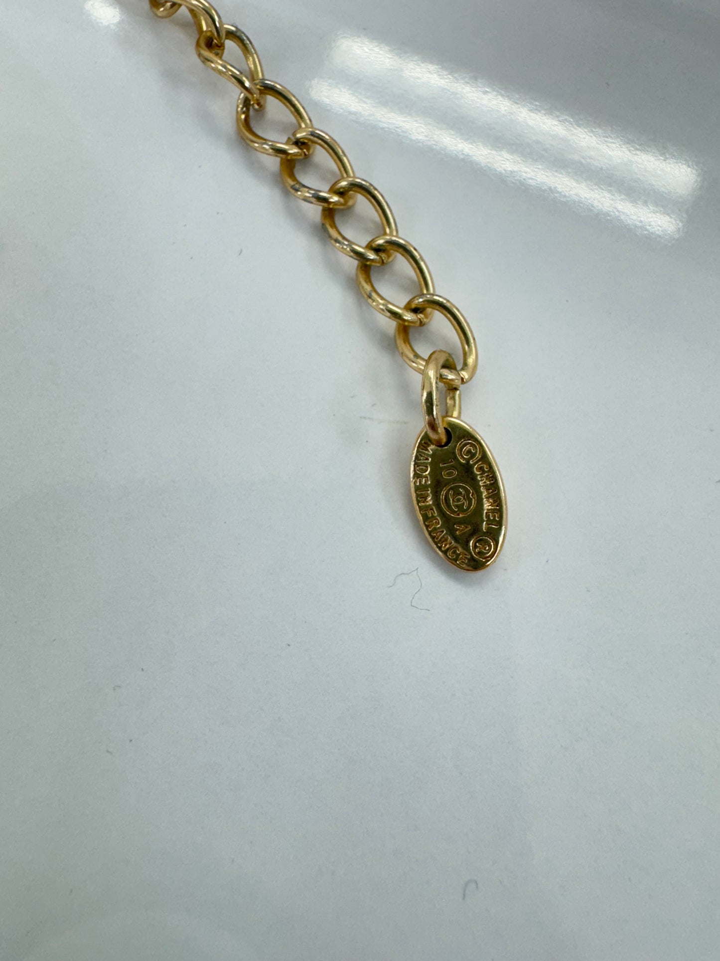 The necklace closes with a lobster clasp and has an adjustable length. The oval Chanel tag is stamped CHANEL® Made in France, with a date code denoting authenticity.
