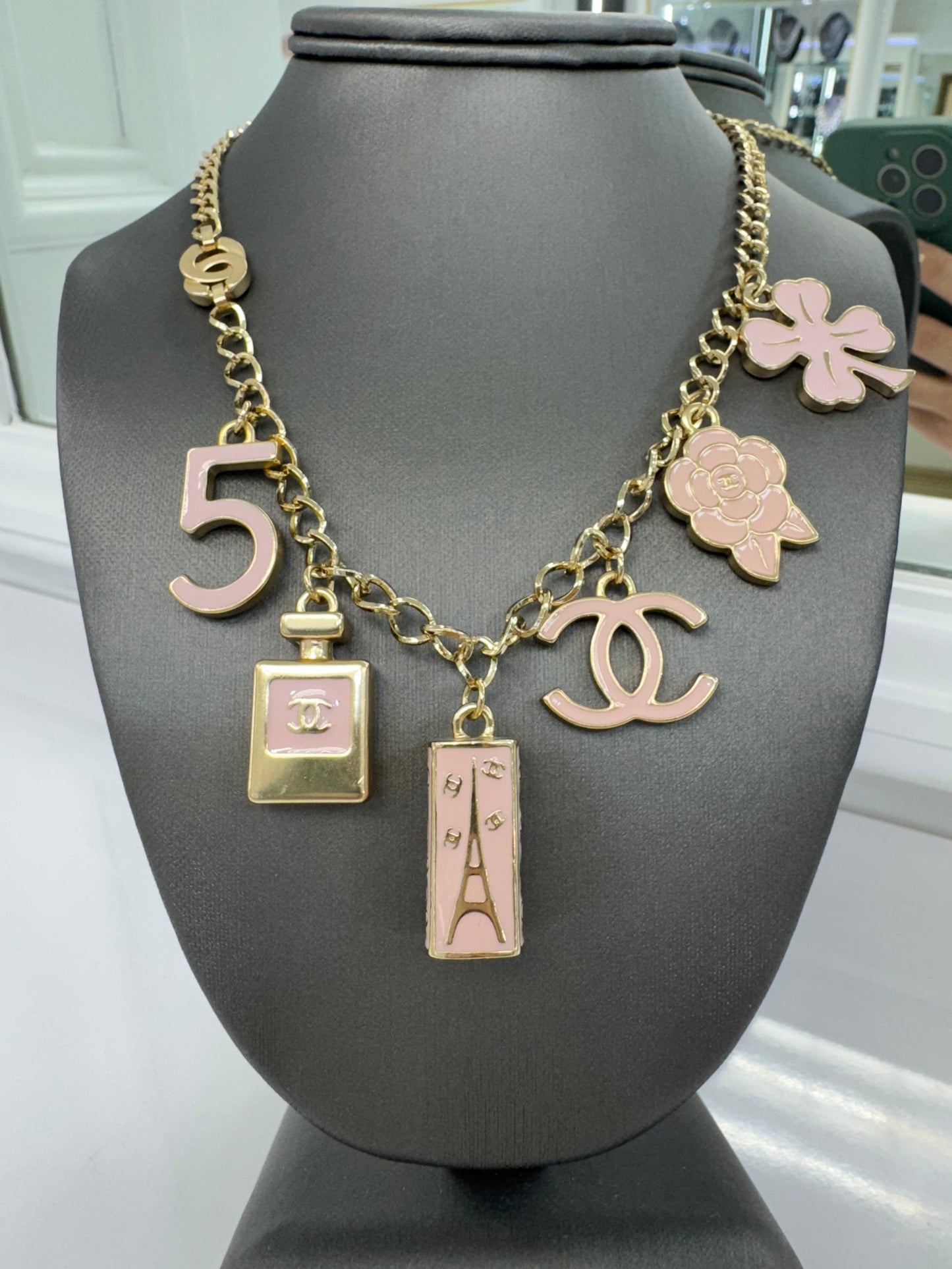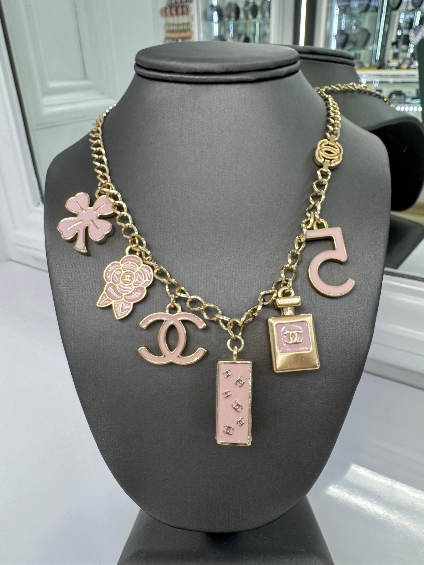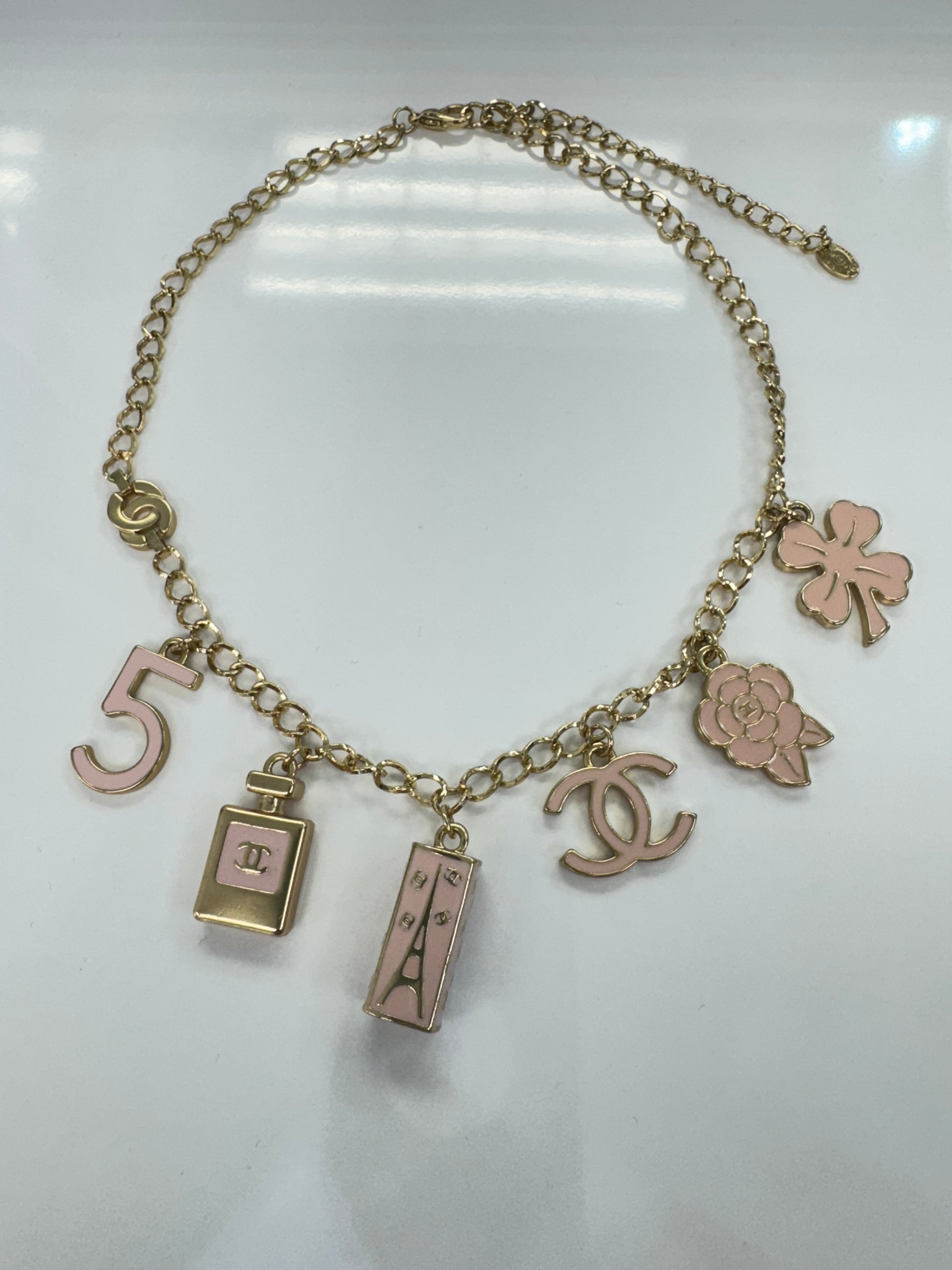 Authentic Chanel Vintage Gold-Tone Charm Necklace Pink Enamel with Iconic Motifs – Made in France