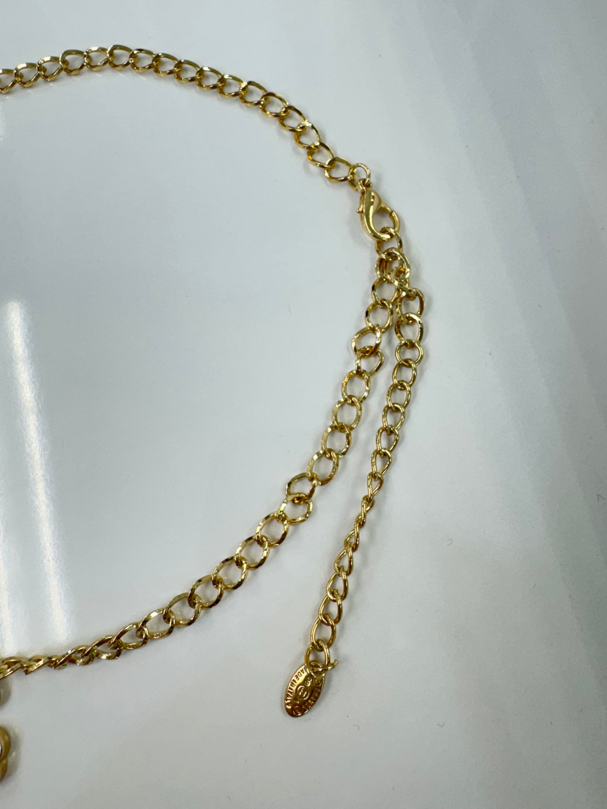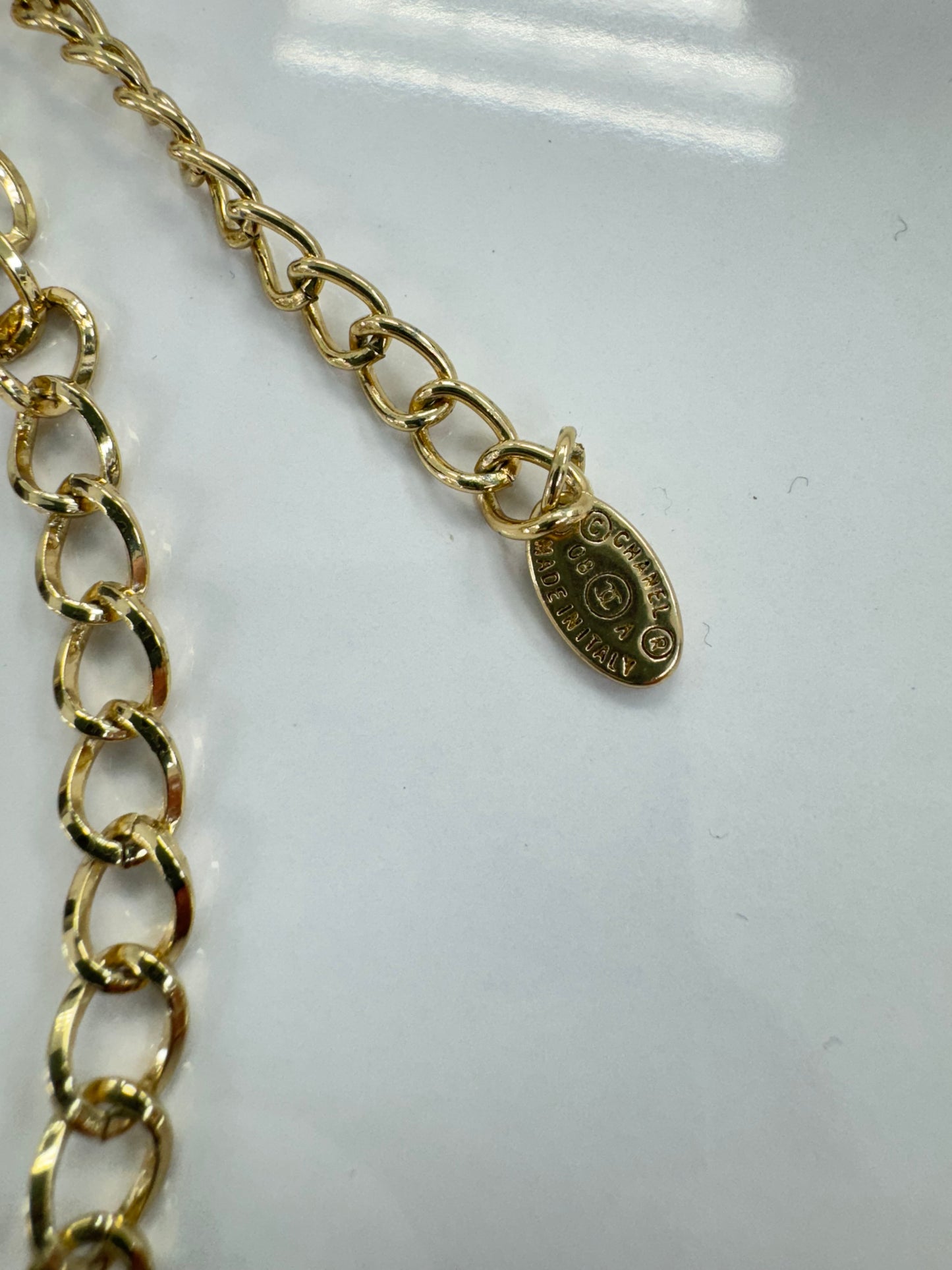 This authentic vintage Chanel charm necklace is a striking statement piece that captures the elegance and heritage of the iconic fashion house. Crafted in rich gold-tone metal, the necklace features a bold chain design adorned with signature Chanel symbols, including: