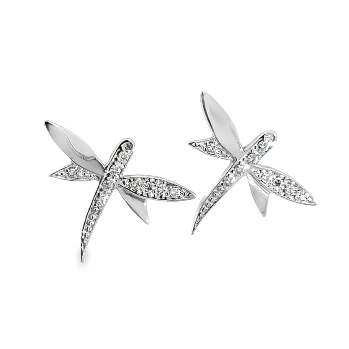 The delicate wings of the dragonflies are beautifully captured in polished white gold, creating a representation of nature in mid-flight. Each earring is adorned with cubic zirconia adding a touch of sparkle. A sweet addition to your collection.
