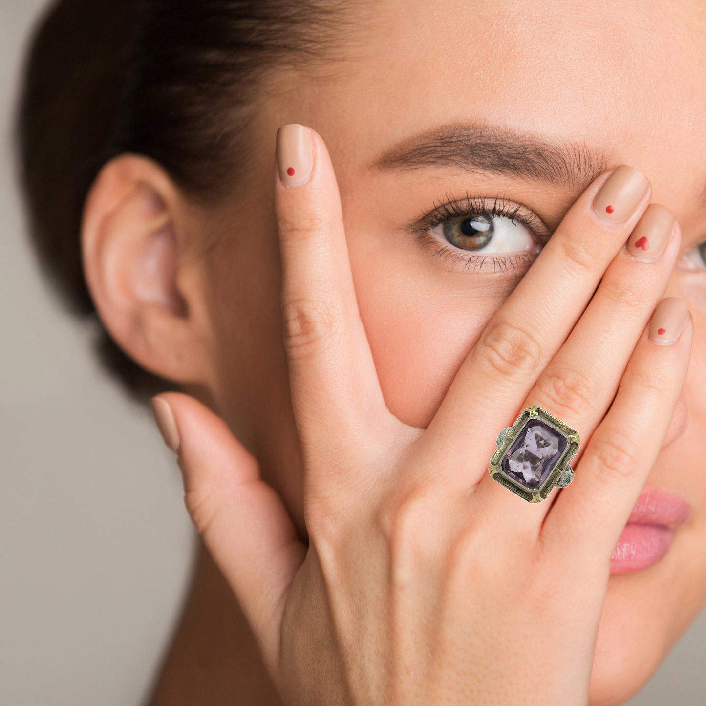 This vintage 14K white gold ring is a true masterpiece of craftsmanship, reminiscent of a museum-quality treasure. The large, radiant amethyst at its center captivates with its rich purple hue, expertly cut to catch and reflect light from all angles. The intricate filigree work on the band showcases the exceptional artistry, with delicate, lace-like patterns woven throughout the metal. The ornate bezel setting, enhanced by subtle golden accents, frames the amethyst beautifully, adding an extra layer of elegance to this already extraordinary piece. A striking example of timeless design, this ring embodies both luxury and heritage.