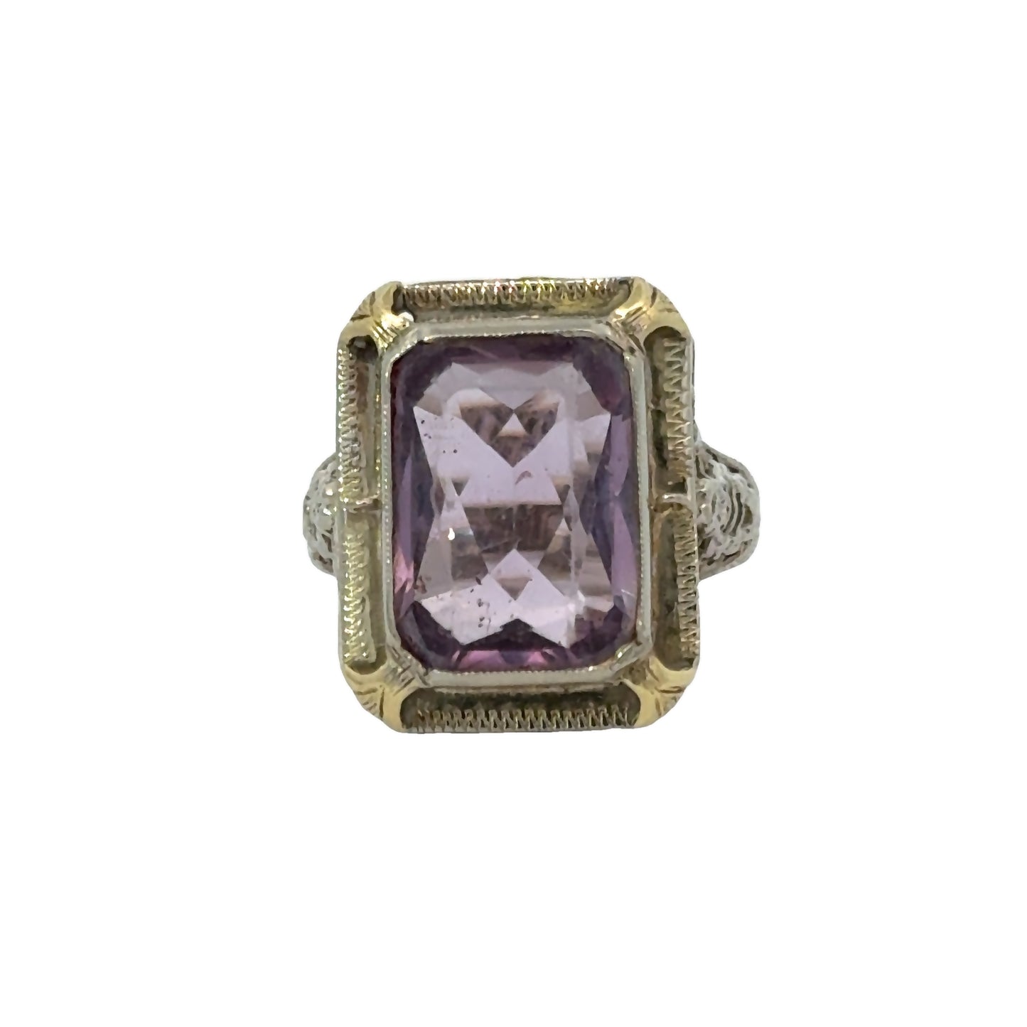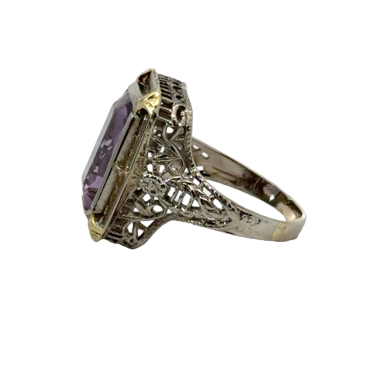 14K White Gold, Filigree, Large Emerald-Cut Amethyst, Vintage, Size 6 |