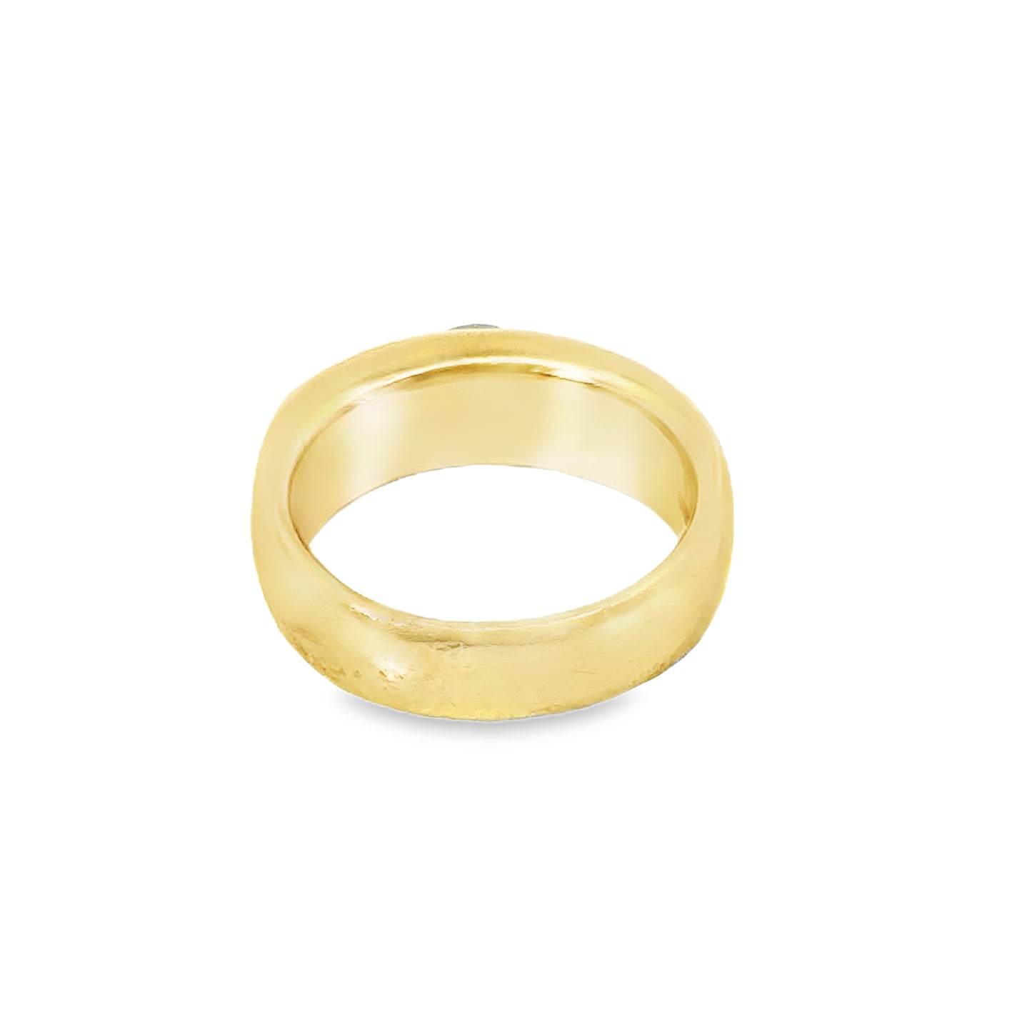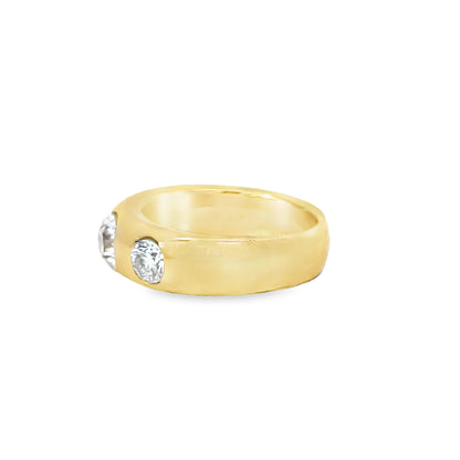 This exquisite 18K yellow gold ring features a classic and elegant design, showcasing three stunning SI/G diamonds set in a bold and smooth band. The bezel-set diamonds add a refined touch, ensuring durability and security while enhancing the brilliance of each stone. The solid gold band has a slightly rounded shape, offering a comfortable fit with a sophisticated, minimalist aesthetic. A timeless and versatile piece, this ring can be worn as a wedding band, statement piece, or everyday luxury accessory.