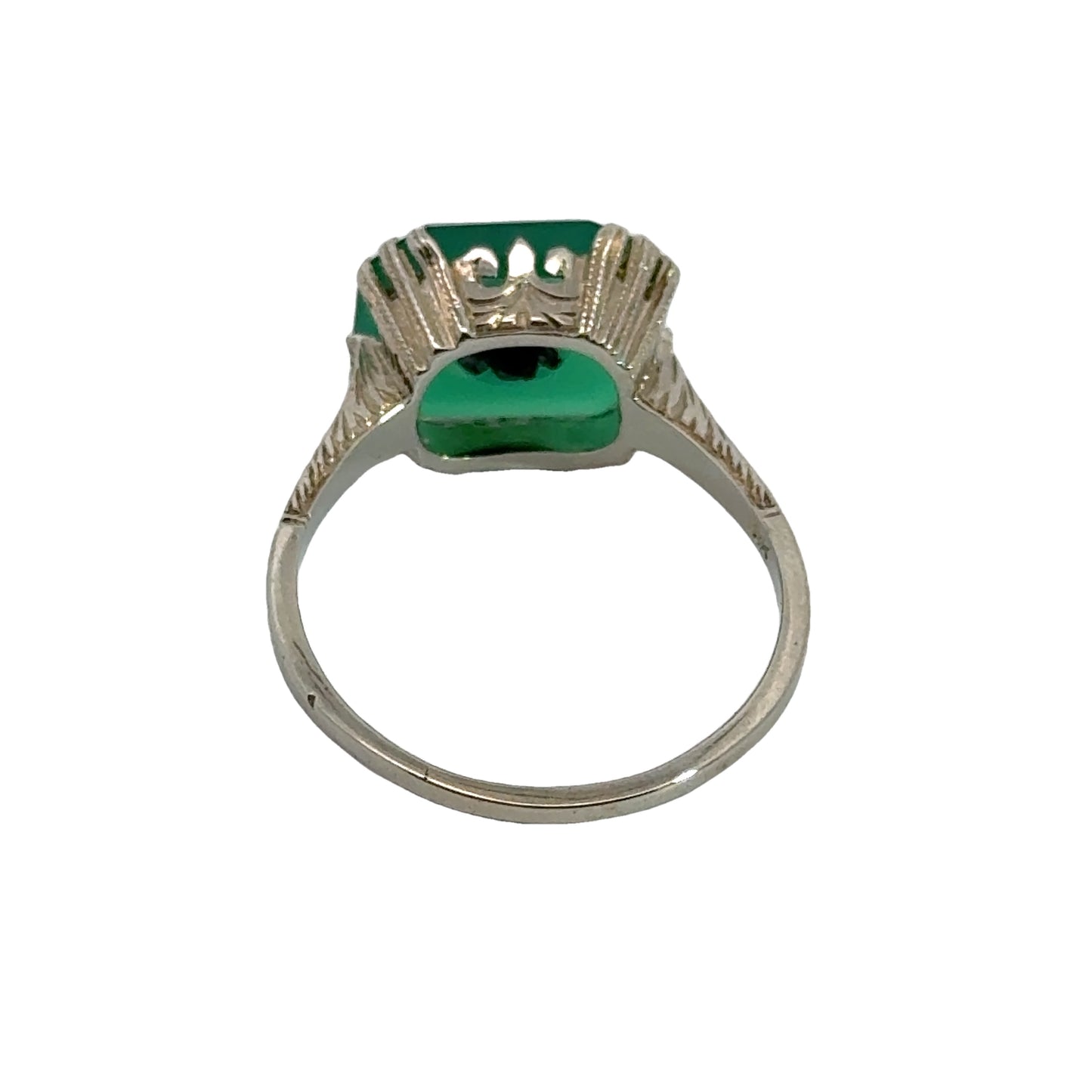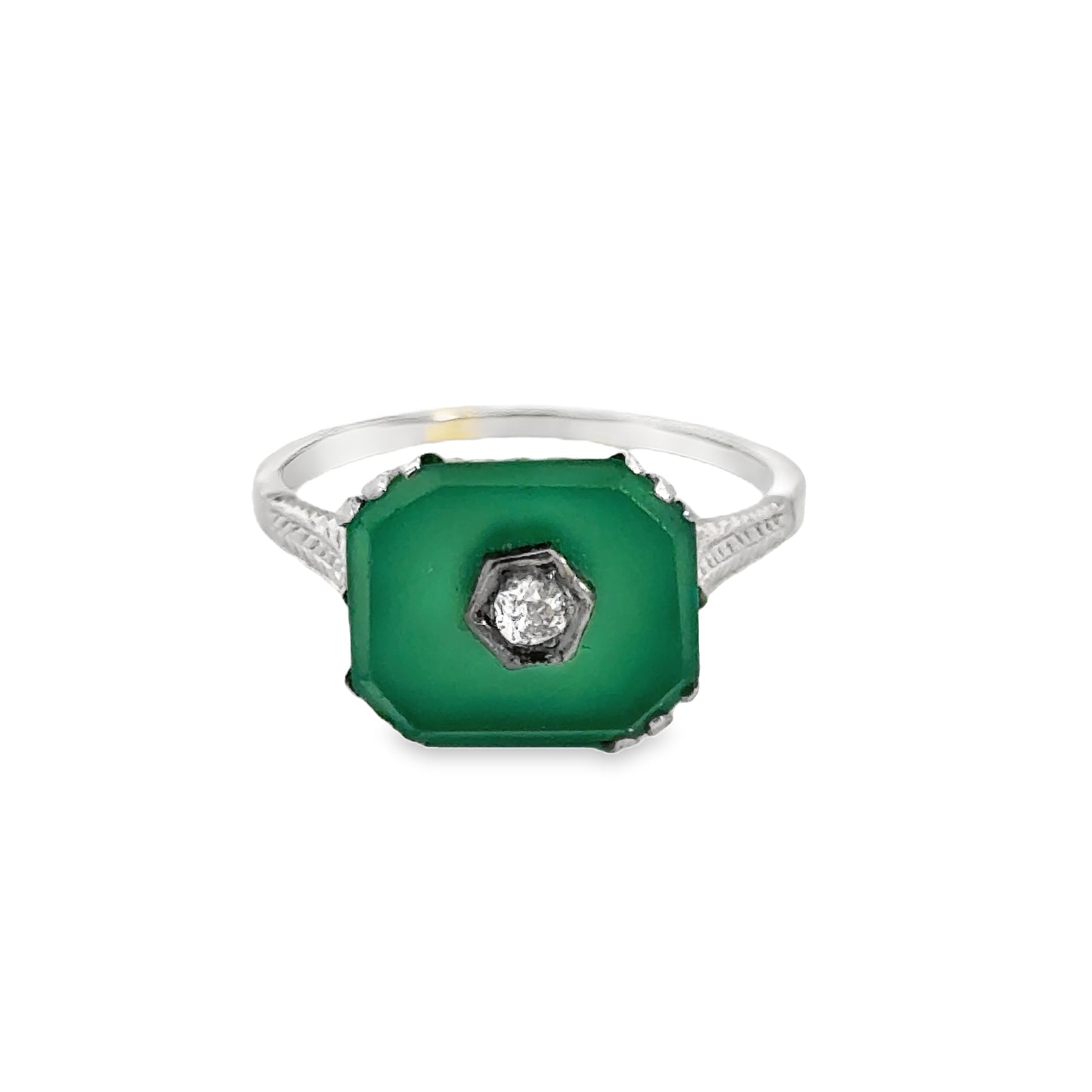 This captivating 18K white gold ring features a striking jade gemstone, intricately cut into a unique octagonal shape that adds a bold and distinctive flair to the design. At its center, a single sparkling diamond is set within a hexagonal bezel, providing a modern contrast to the rich green of the jade. The ring’s band is delicately engraved with detailed patterns, further enhancing its vintage aesthetic. A one-of-a-kind piece, this ring stands out for its combination of geometric shapes, high-quality craftsmanship, and the enchanting beauty of jade.