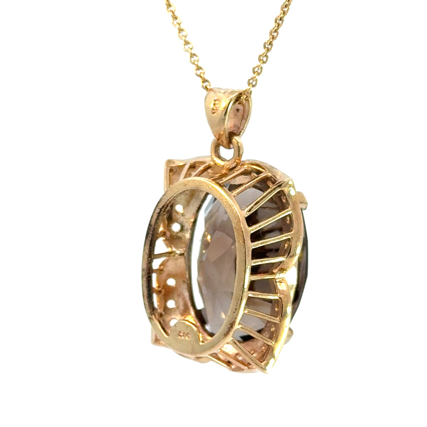 This elegant 1980s vintage pendant is crafted from yellow gold and features a striking oval-cut smoky topaz as its centerpiece. The smoky topaz, with its rich, deep brown hue and excellent faceting, exudes a warm, earthy elegance typical of the eras bold gemstone designs.