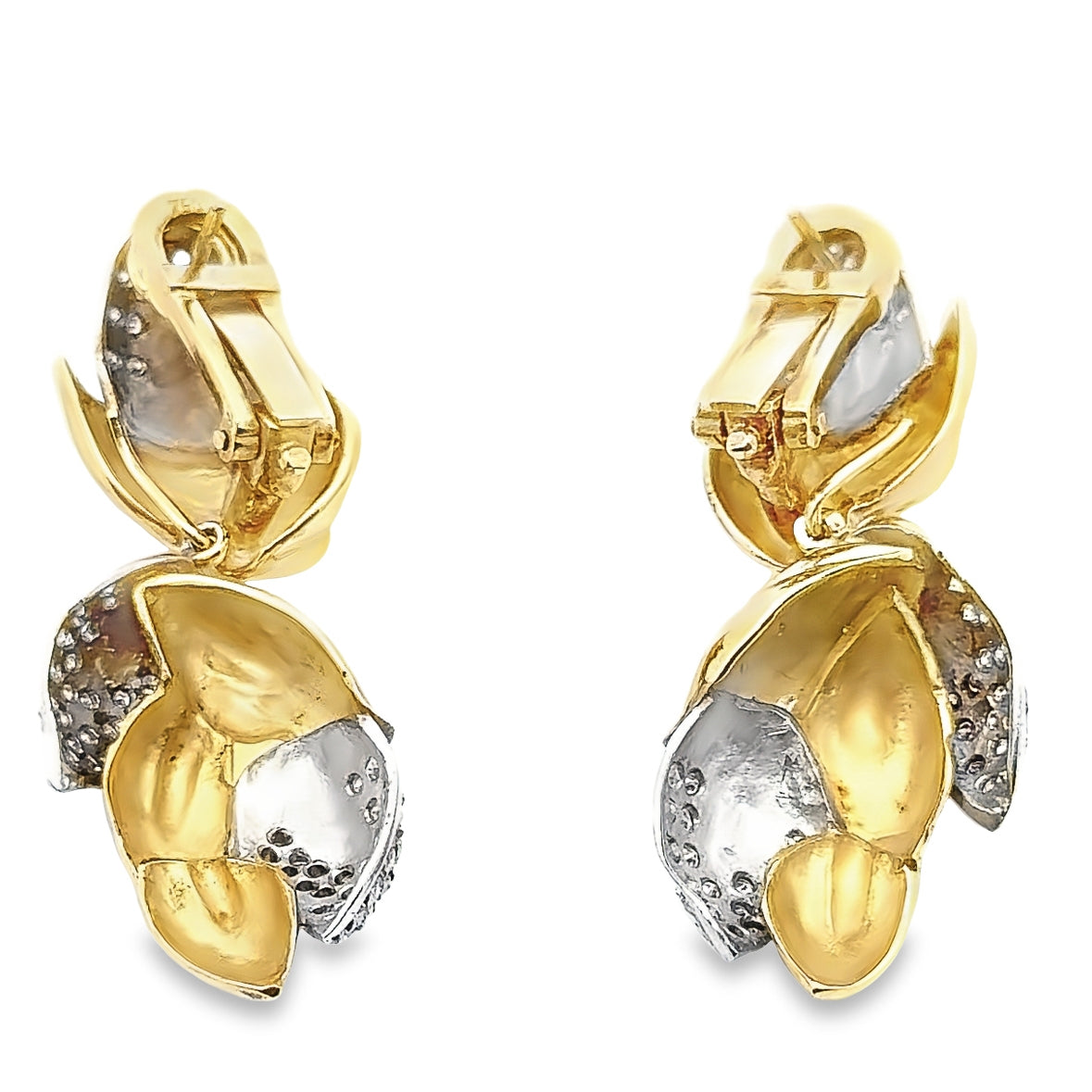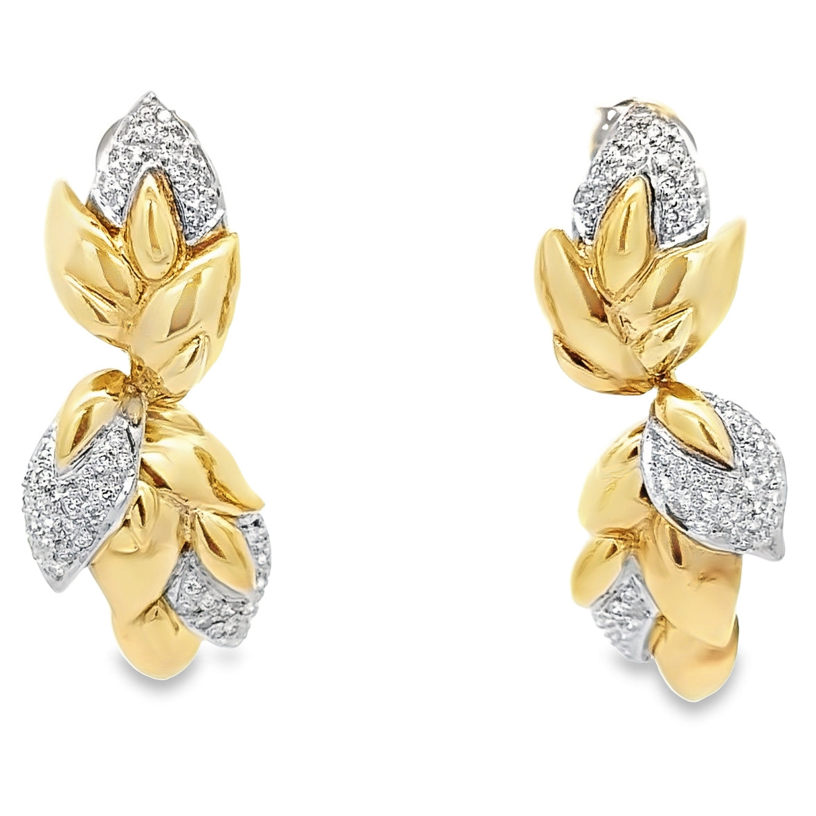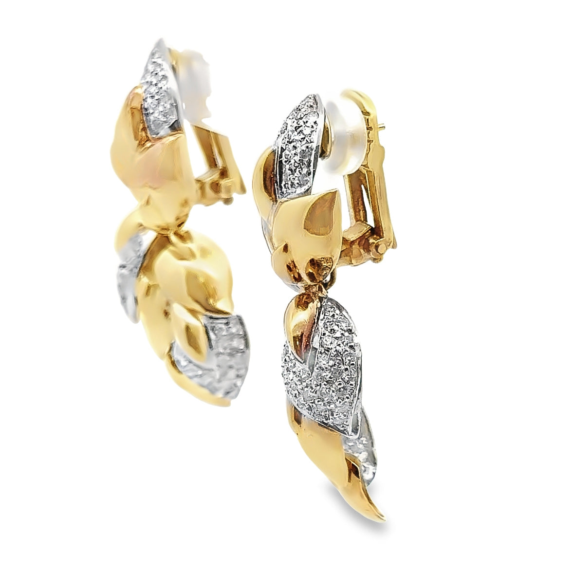 Admirable estate 18K yellow and white gold cascading leaves earrings. The special cascading design give a sense of movement and elegance, making these earrings truly captivating. Yellow gold alternates with white gold diamond clusters creating a spellbinding contrast. A perfect statement piece for a special occasion.