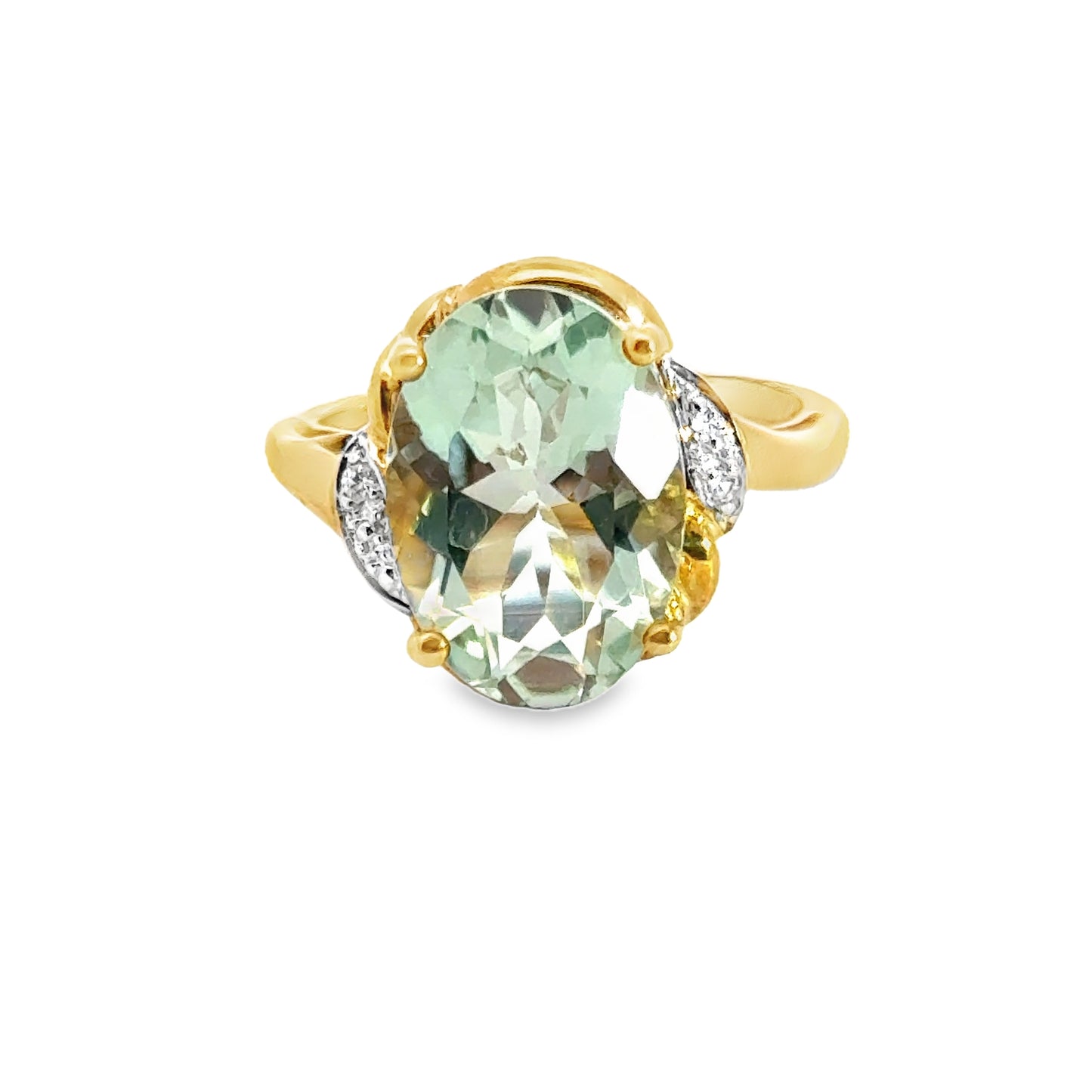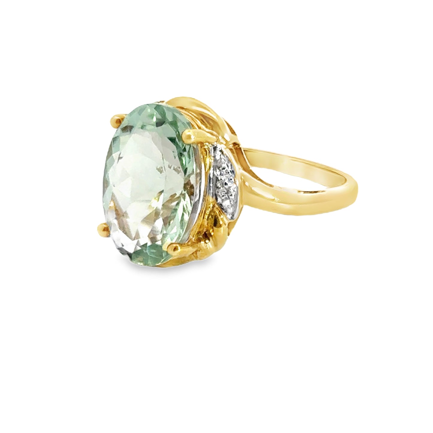 Striking yellow gold ring showcases an impressive oval-cut aquamarine gemstone with a mesmerizing ocean green-blue color. The stone is set in an elegant, four-prong setting that lifts it high, allowing the light to fully enhance its captivating hue. On either side of the aquamarine, diamond accents add a touch of sparkle, making the ring even more eye-catching. The gold band complements the gemstone’s cool tones, creating a harmonious balance between warm and cool colors. Perfect for those who love both the beauty of the sea and the elegance of diamonds, this piece is timeless and sophisticated.