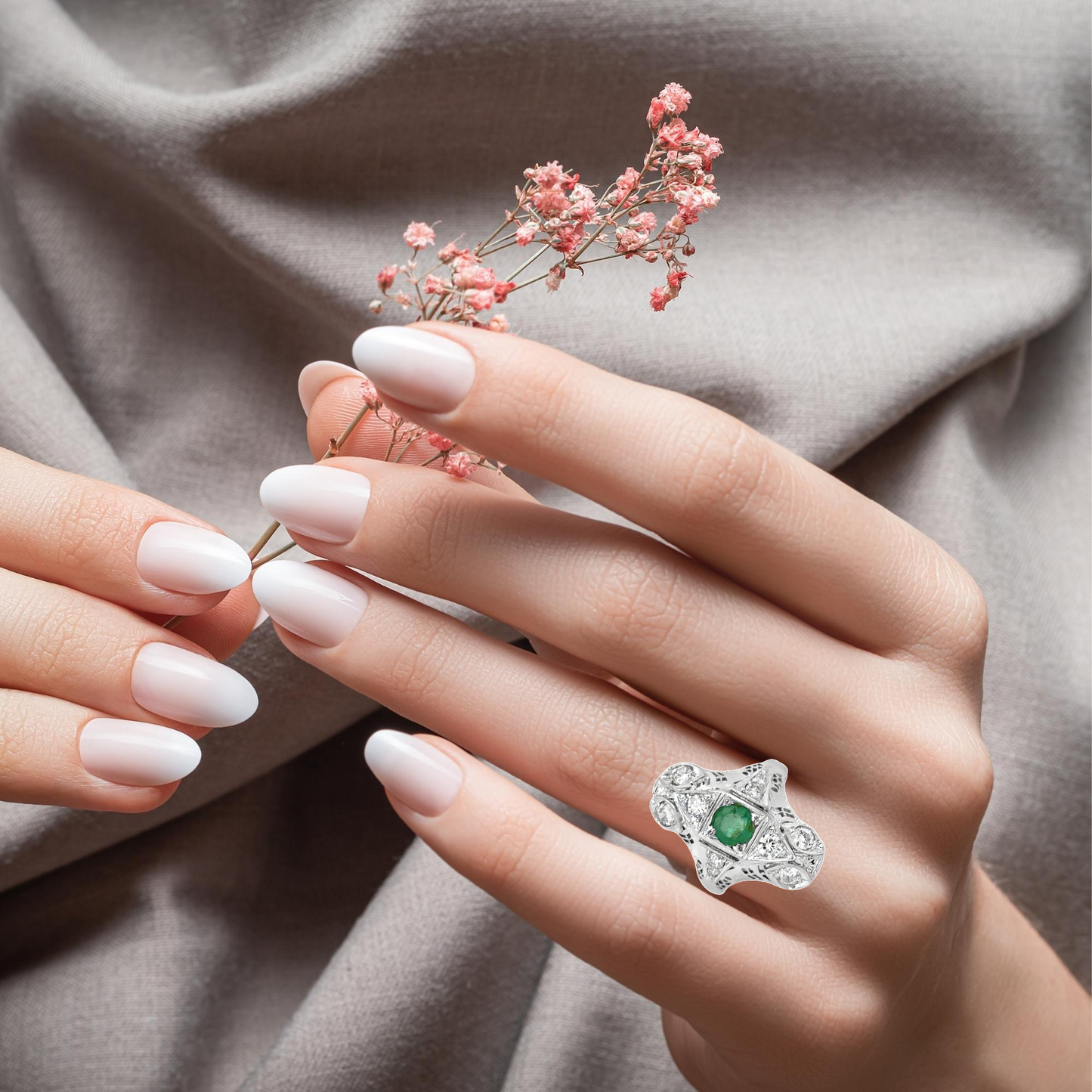 This breathtaking 18K white gold antique engagement ring showcases exceptional craftsmanship and intricate detailing. The vibrant emerald at the center is beautifully framed by sparkling diamonds arranged in an elegant, geometric design that captures the eye. The delicate filigree work and open design add depth and texture, making the ring a true work of art. Its combination of rich emerald and brilliant diamonds creates a striking contrast that adds to the ring’s timeless allure. A joy to behold, this piece is not only a symbol of love but also a magnificent statement of style and beauty, perfect for someone who appreciates both tradition and luxury.