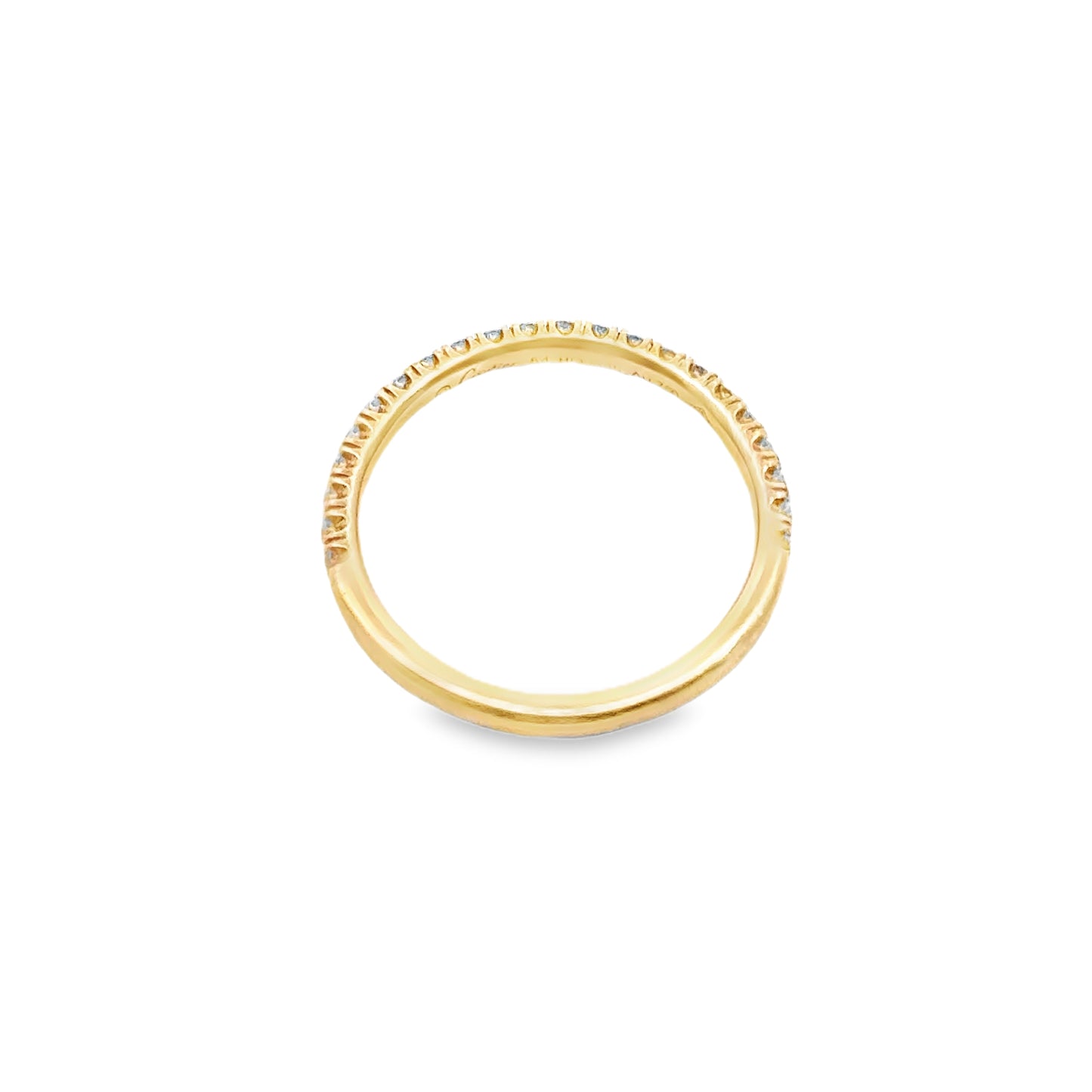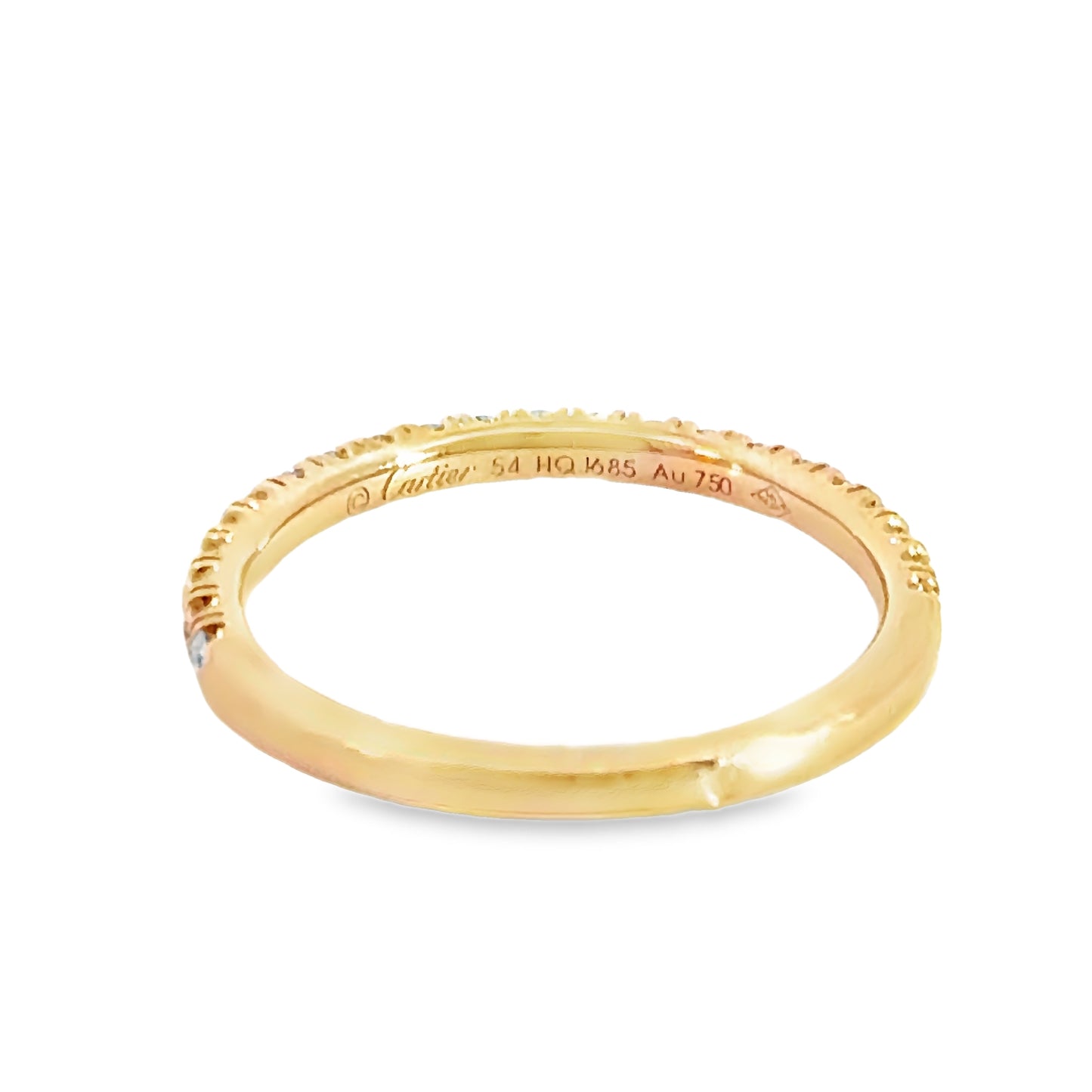 The Etincelle de Cartier Wedding Band is a refined and elegant ring crafted from 18K yellow gold, adorned with a row of sparkling round-cut diamonds. The diamonds are expertly set in a continuous half-eternity design, creating a shimmering line of brilliance across the front of the band. The contrast between the rich yellow gold and the bright, sparkling diamonds highlights Cartier’s meticulous craftsmanship and attention to detail. This delicate yet luxurious wedding band is perfect for symbolizing everlasting love and can be worn on its own or paired with other rings for a sophisticated, layered look.