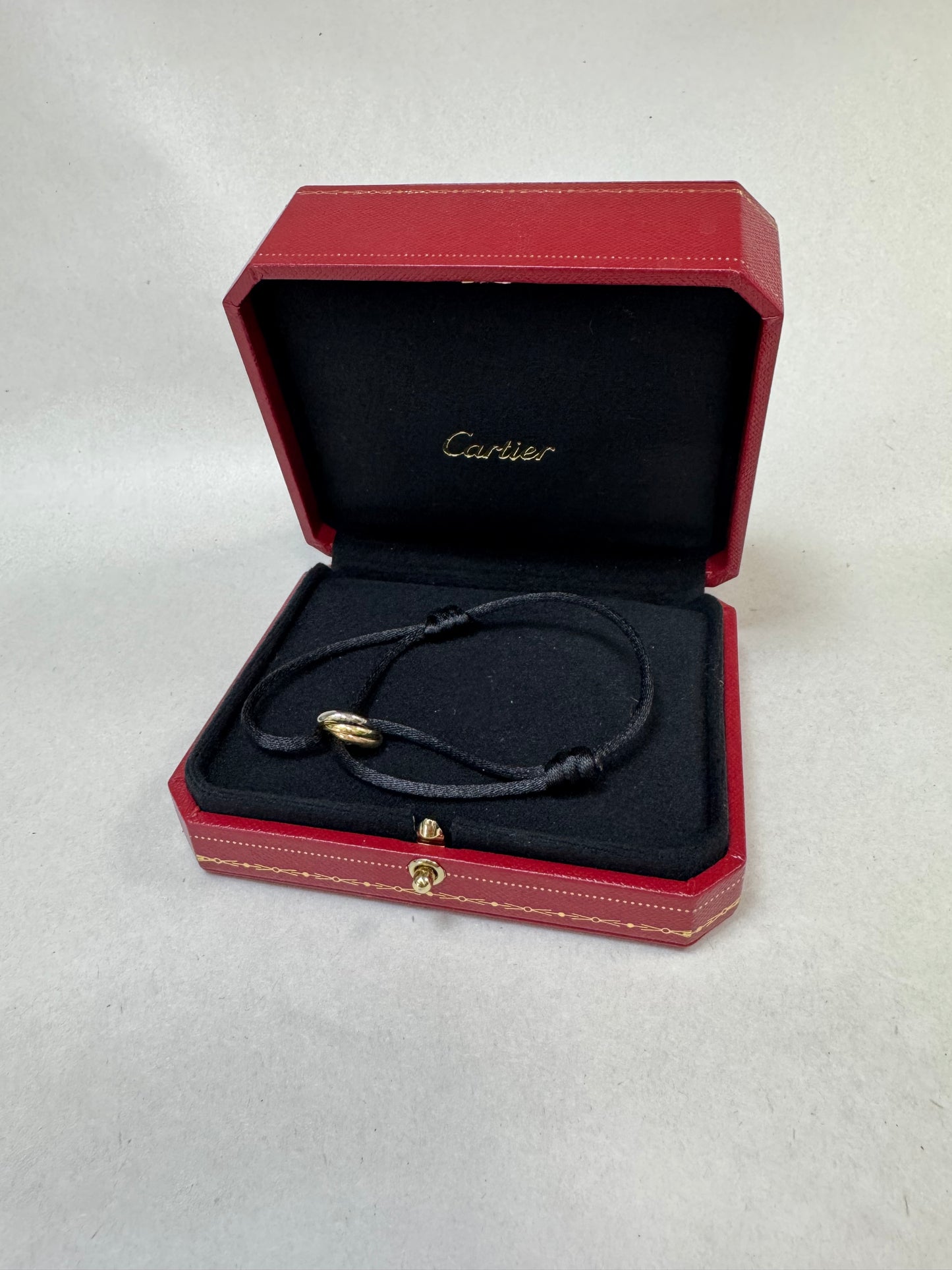Cartier Trinity bracelet featuring the iconic Trinity ring motif, which is crafted from 18k yellow, white, and rose gold intertwined bands. This design, introduced by Louis Cartier in 1924, symbolizes love, fidelity, and friendship. The bracelet is attached to an adjustable black cord, making it both elegant and versatile for everyday wear.