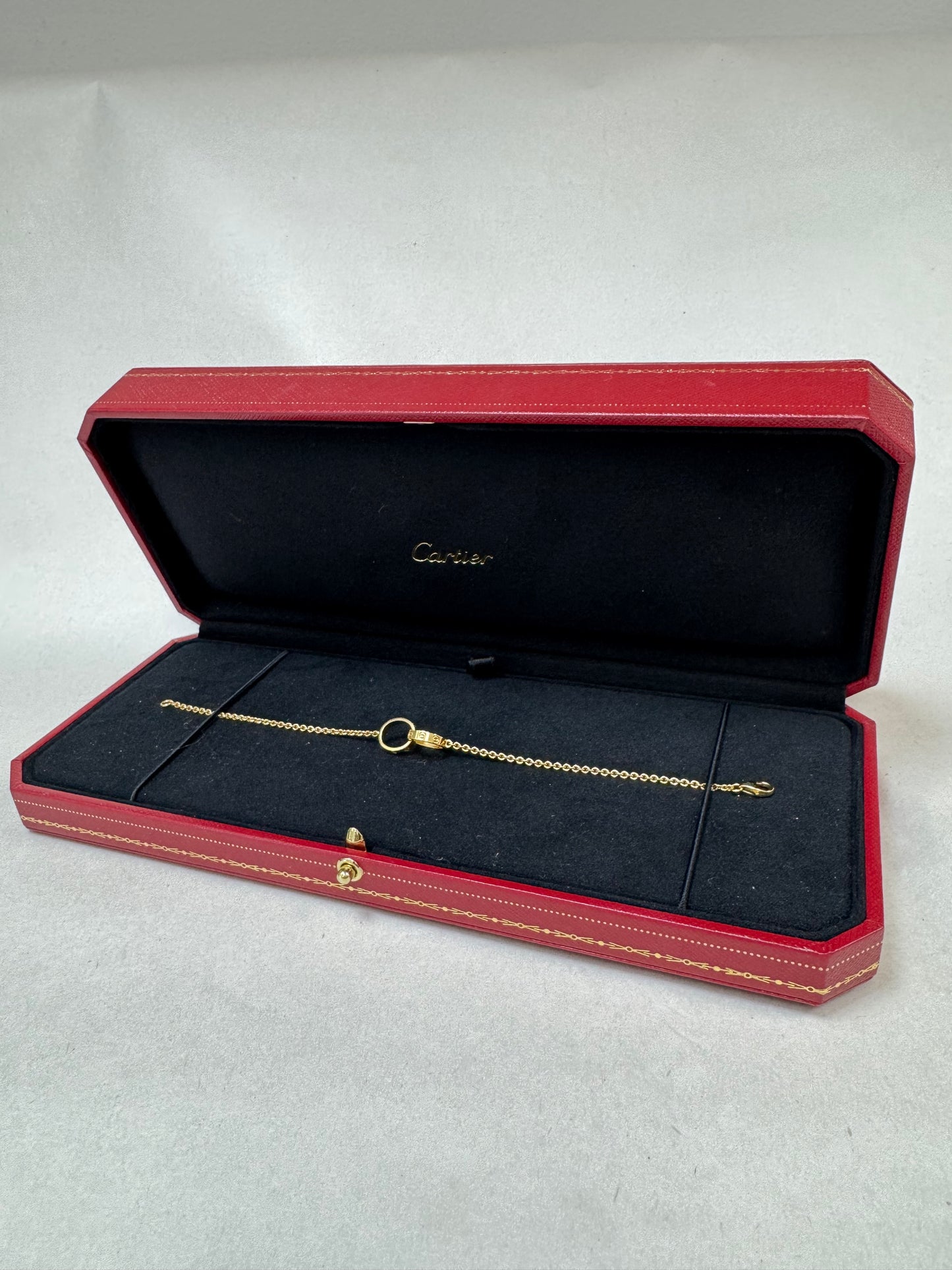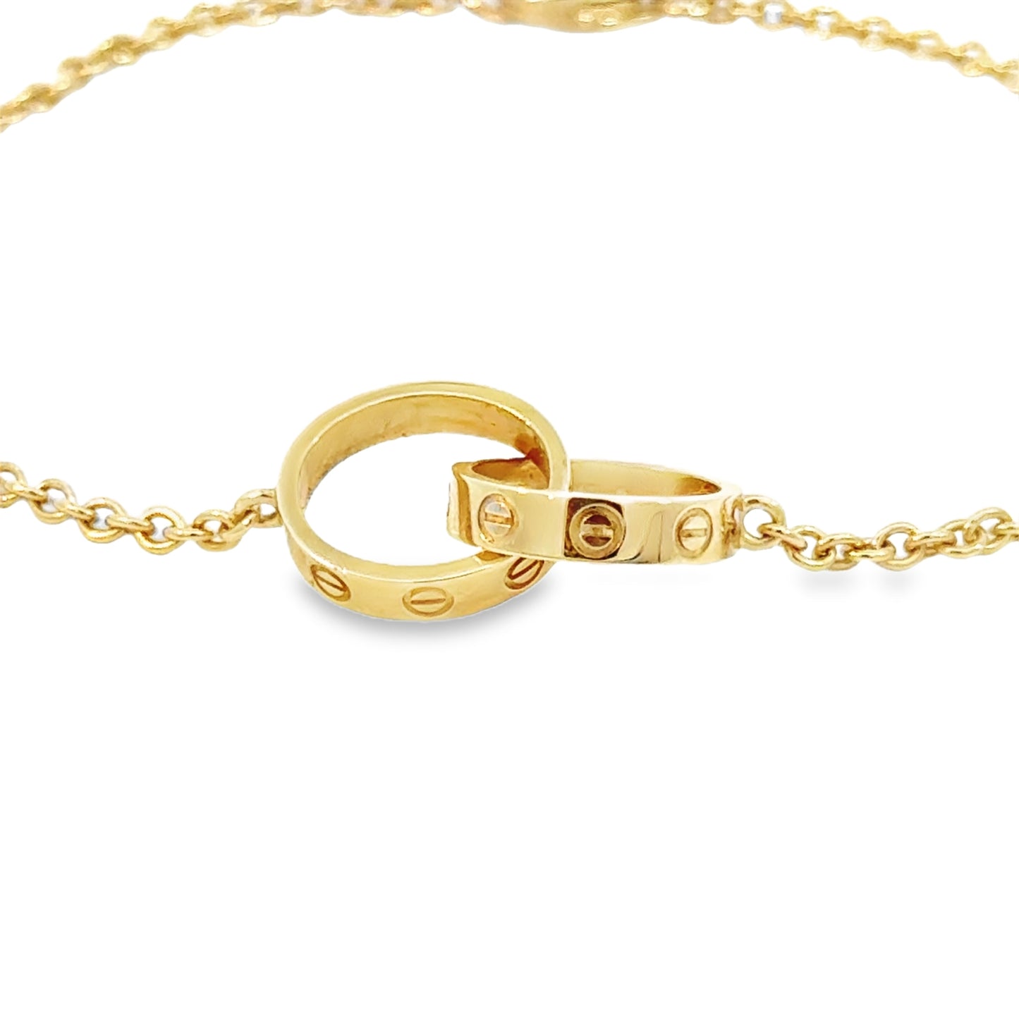 Cartier Love bracelet on a chain, crafted in 18k yellow gold. The bracelet features two miniature interlocking Love rings, each adorned with Cartier’s signature screw motif. The delicate gold chain is secured with a lobster clasp, offering a refined and elegant look. This piece is a modern take on the classic Cartier Love design, symbolizing unity and everlasting love. Ideal for stacking or wearing alone, it embodies timeless sophistication.