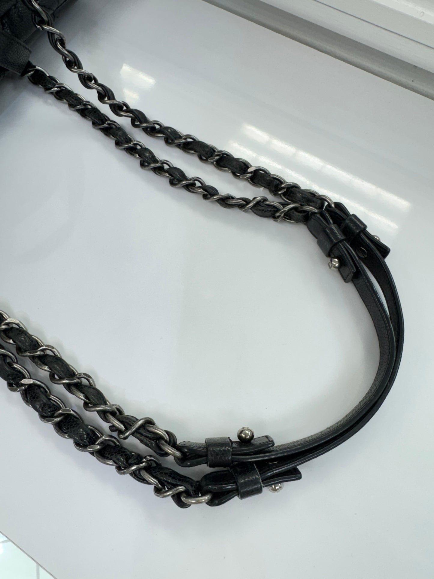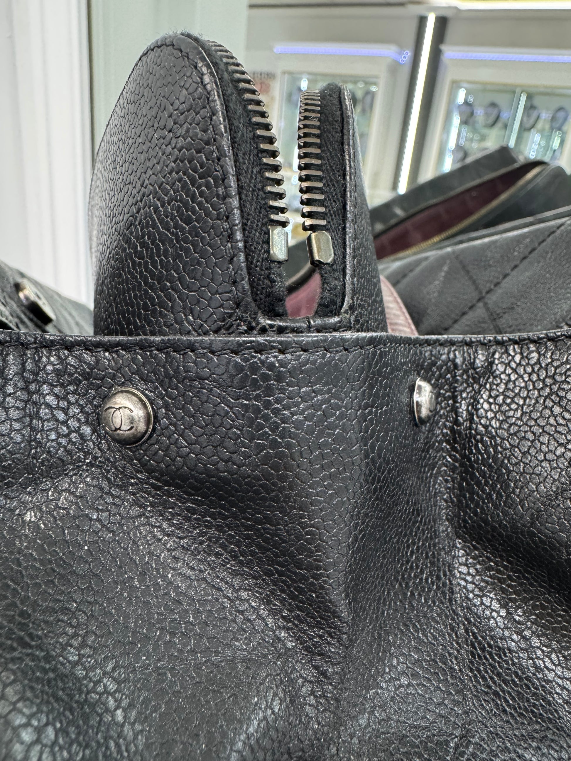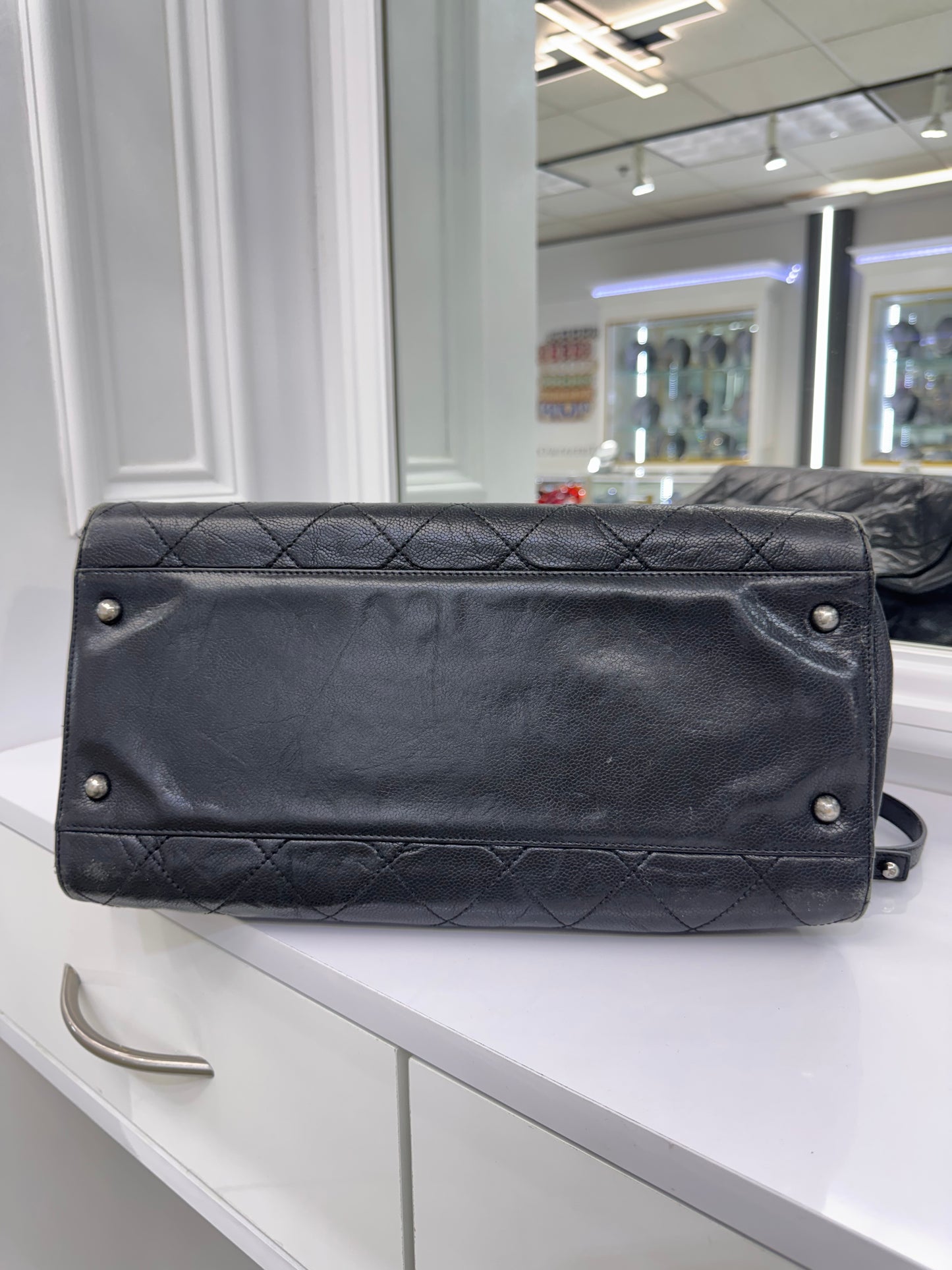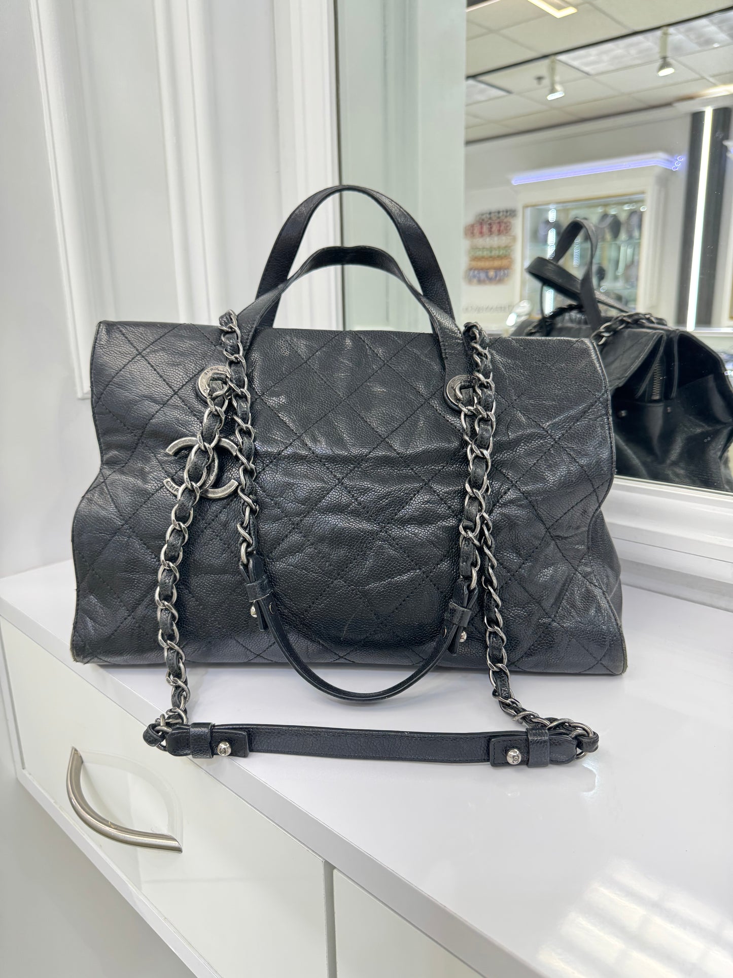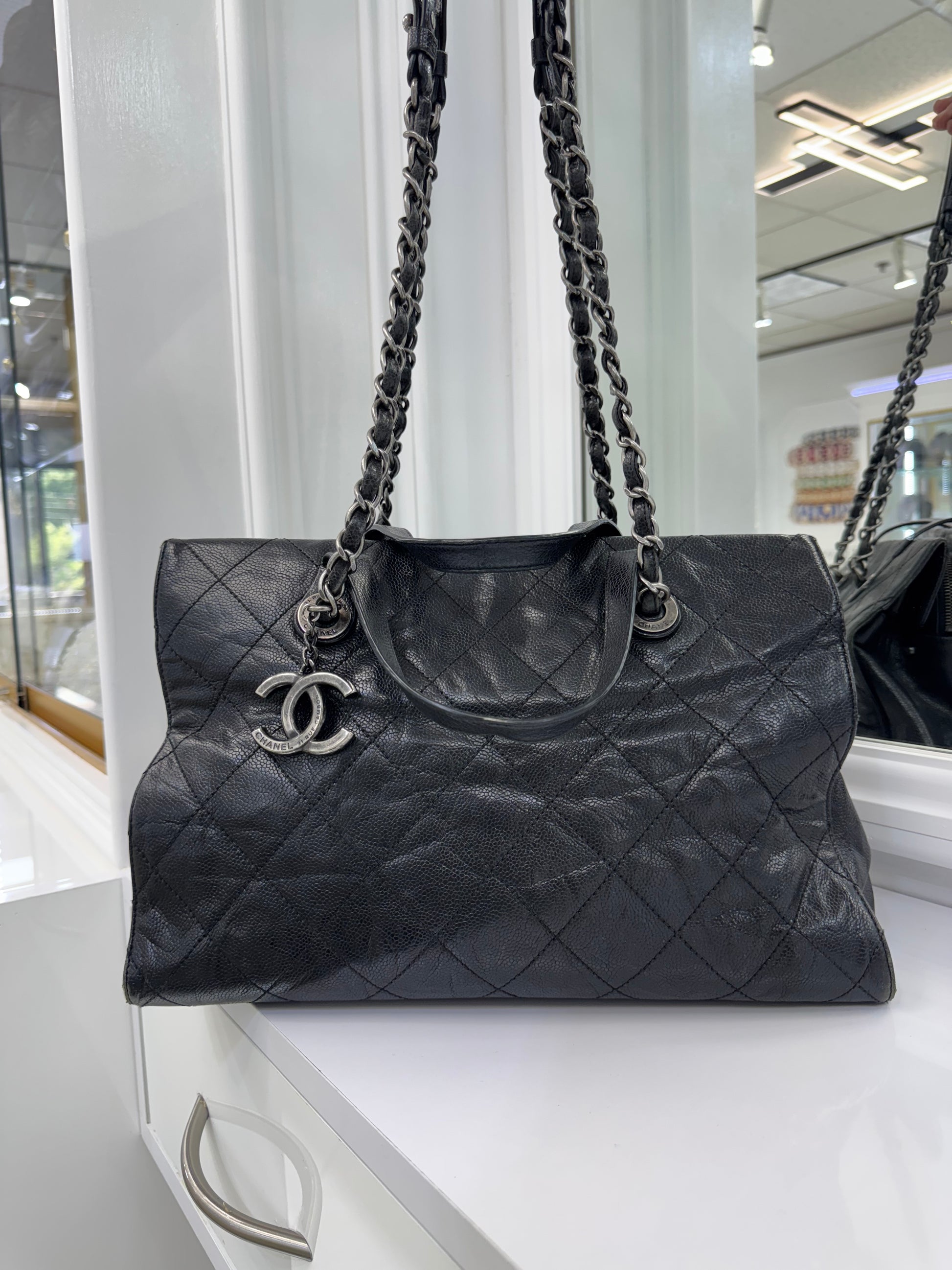 Chanel Large Quilted Caviar Leather Tote with Chain & Top Handles – Black / Burgundy Interior