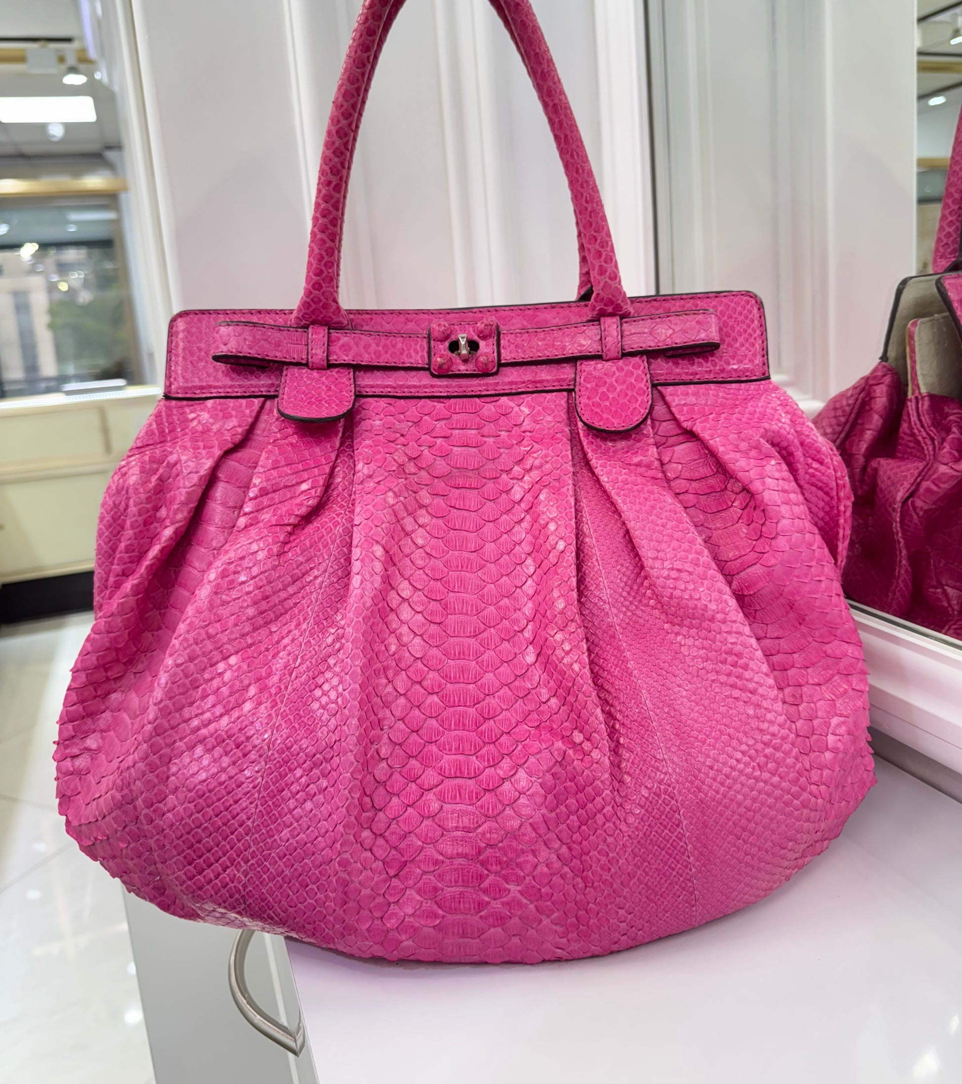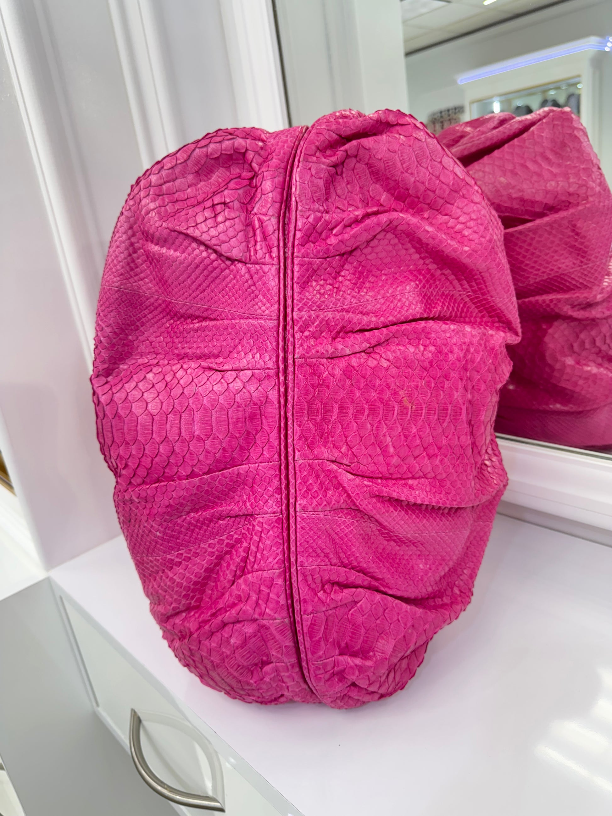 Elevate your accessories collection with this striking Zagliani handbag, a true expression of exotic luxury and sophisticated craftsmanship. Expertly handcrafted in Italy, this tote is made from authentic python skin in a vibrant fuchsia hue that commands attention. The soft, voluminous silhouette is accented by elegant pleats and structured rolled handles, while the belted top features a sleek turn-lock closure for added security and style.
