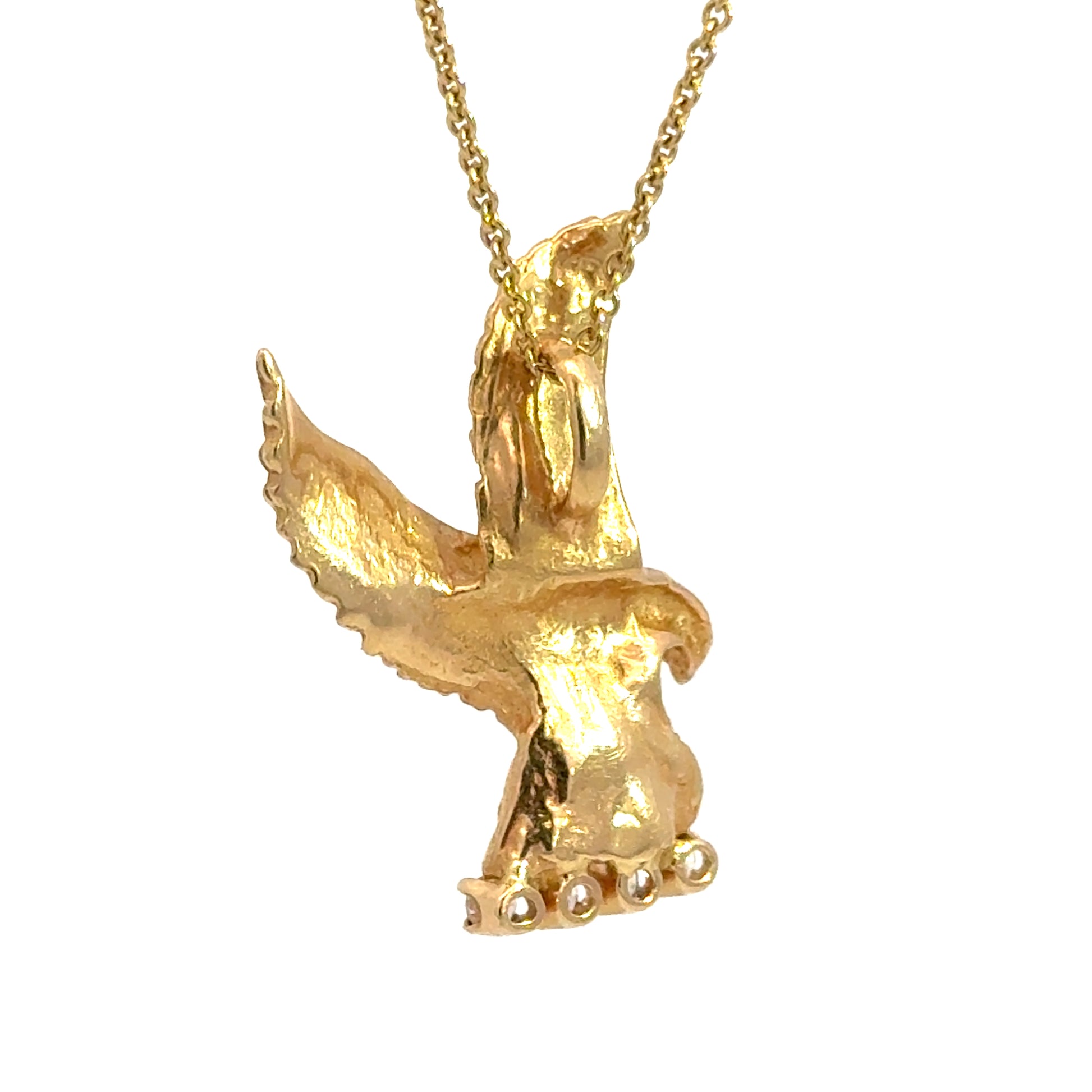 At the base of the pendant, a row of five round-cut diamonds adds a touch of brilliance and luxury, contrasting beautifully with the warm gold tones. These diamonds are securely prong-set, enhancing the pendant’s elegance without overpowering the dynamic eagle motif.