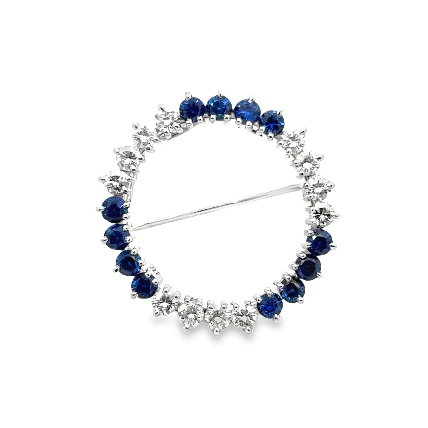 This is a platinum brooch/pendant featuring a circular design set with alternating diamonds and blue sapphires. The first image highlights the front, showcasing the round-cut sapphires’ vibrant blue tones and the diamonds’ brilliant sparkle, creating a harmonious, elegant contrast. The gemstones are prong-set, ensuring security while maximizing their brilliance.
