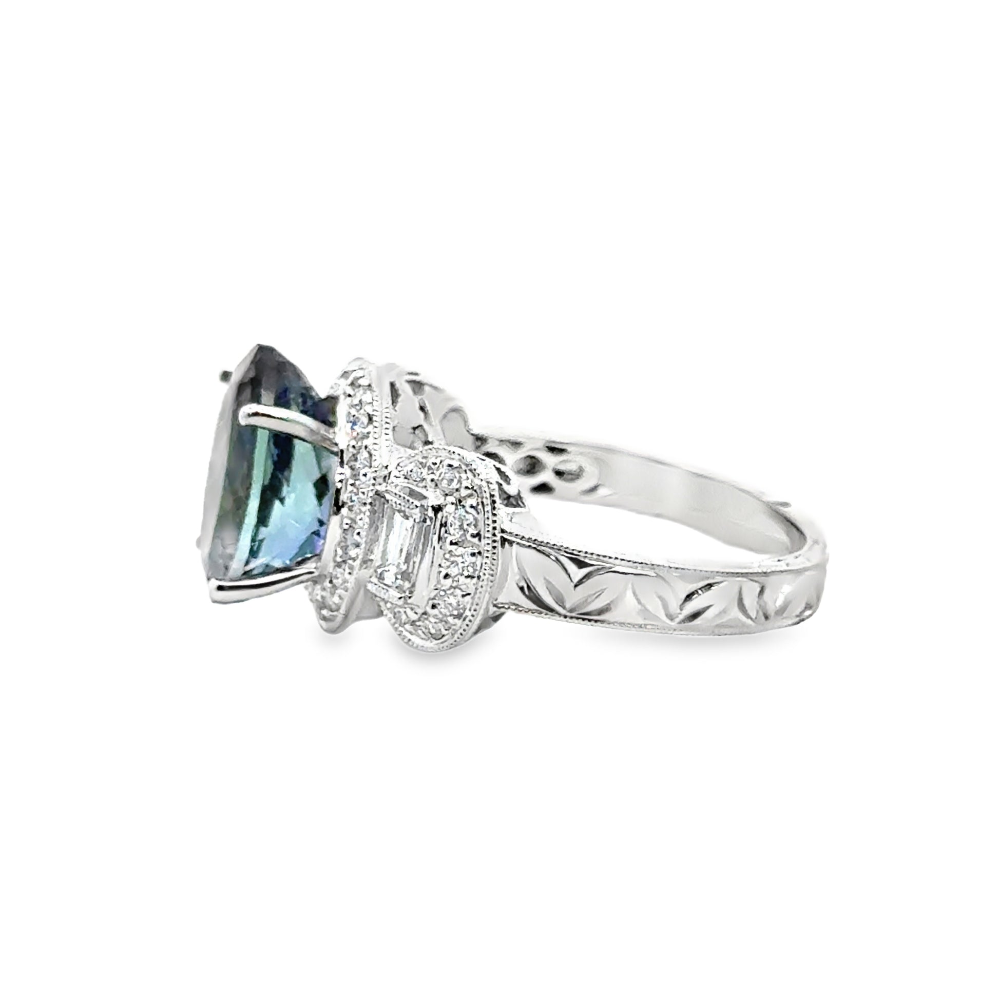 This breathtaking ring combines exquisite craftsmanship with timeless elegance. Crafted in luxurious 18K white gold, it features a magnificent oval-cut tanzanite, approximately 4.49 carats, displaying a mesmerizing play of violet-blue hues. The center stone is framed by a halo of round brilliant-cut diamonds, complemented by two baguette diamonds on each side, creating a striking Art Deco–inspired design. Intricate engraving and filigree detailing along the band and gallery enhance its vintage sophistication.