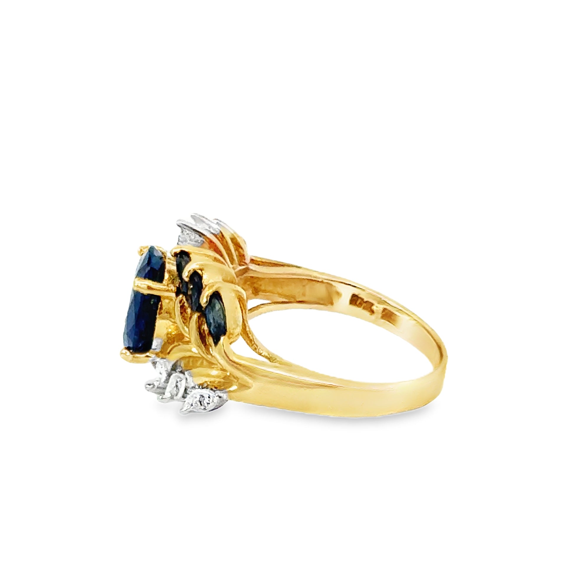 A captivating design inspired by nature’s grace, this 10K yellow gold ring features a vivid oval-cut sapphire of approximately 9x7mm, surrounded by a cascading arrangement of marquise-cut sapphires and delicate diamond accents. The total sapphire weight is approximately 2.30 carats, beautifully contrasted by 0.06 carats of sparkling white diamonds.