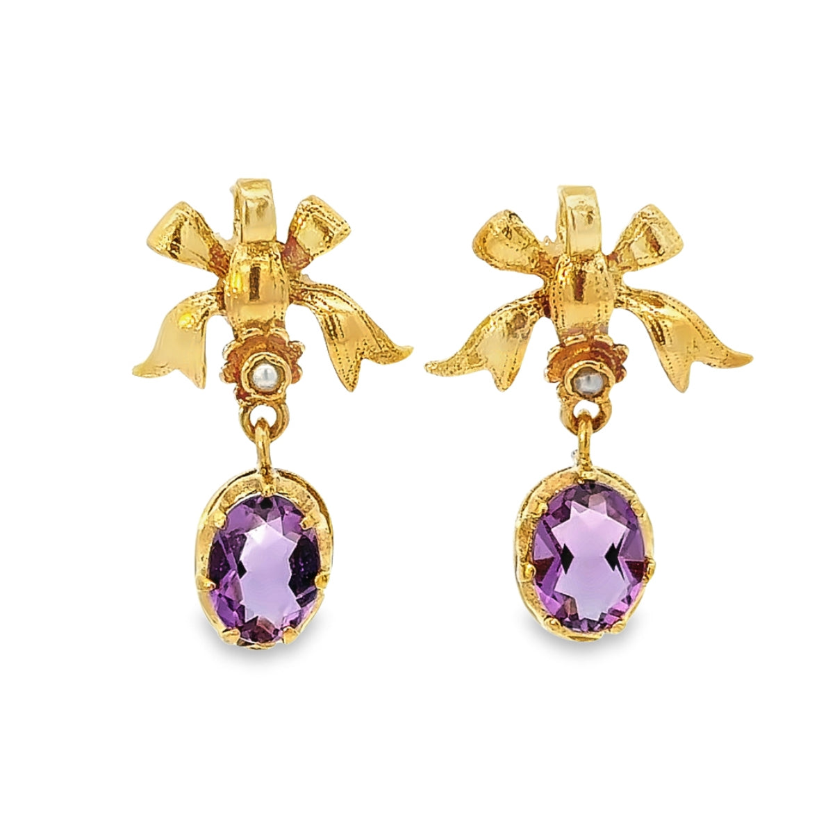 These elegant earrings feature stunning amethyst gemstones set in a vintage gold setting. Each earring is adorned with a delicate bow and pearl detail, adding a touch of charm.