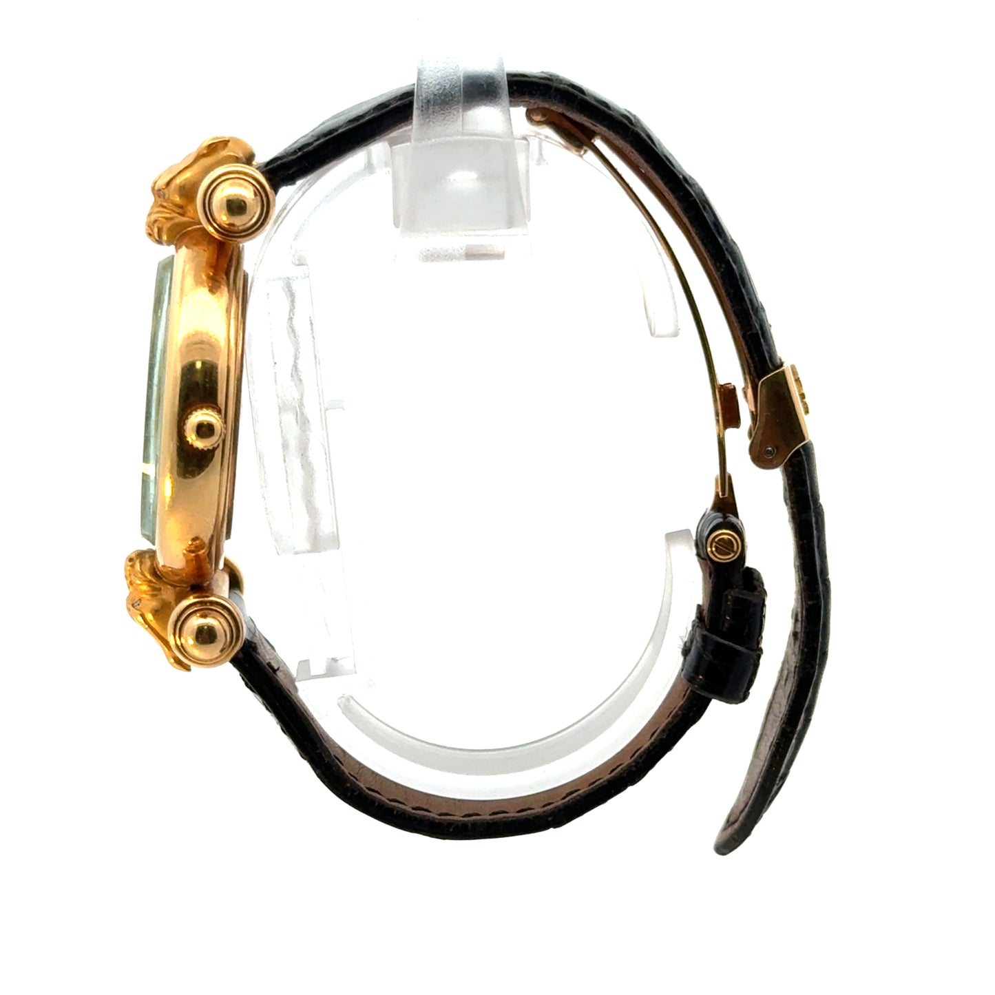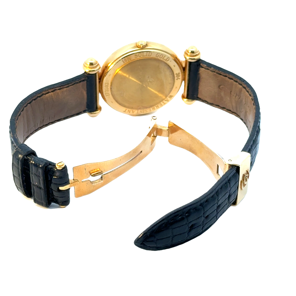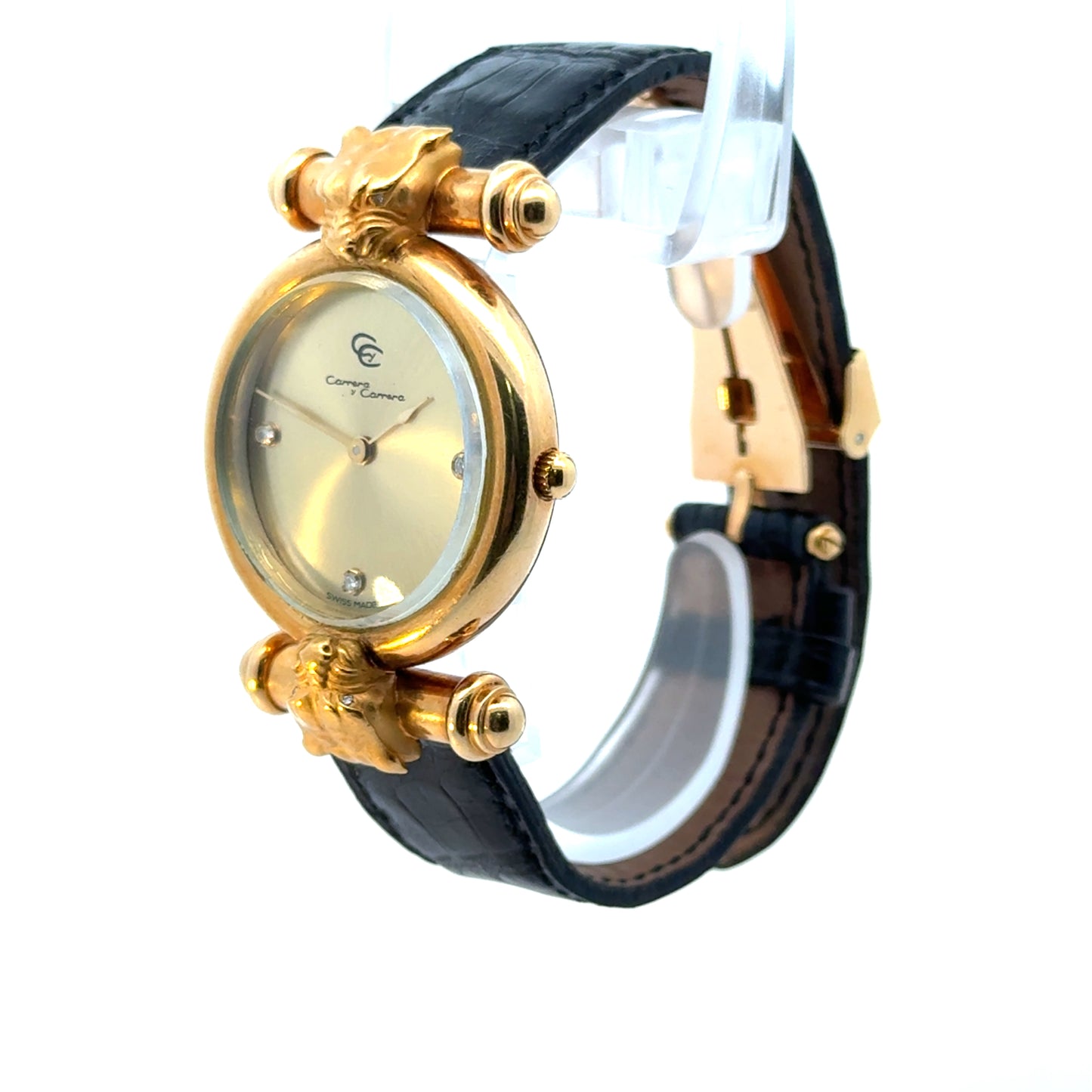 | Carrera Y Carrera, 18K Yellow Gold, 32mm case, 2 panther head lugs, black alligator band with deployment buckle, adjustable band, 32mm case, 7 diamonds: 4 in the eyes of the panthers, 3 on the face of the watch, # 173503, water resistant, quartz movement |