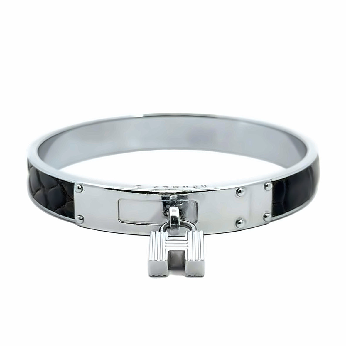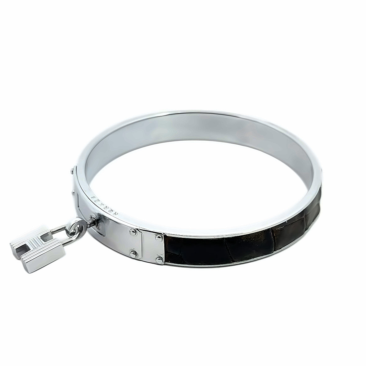 Hermes Silver & Leather Kelly Bangle with Padlock Charm