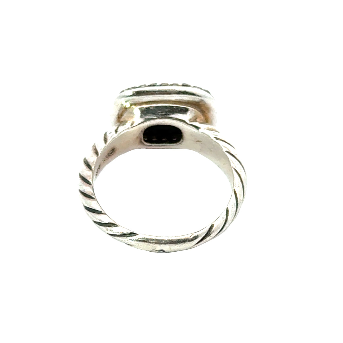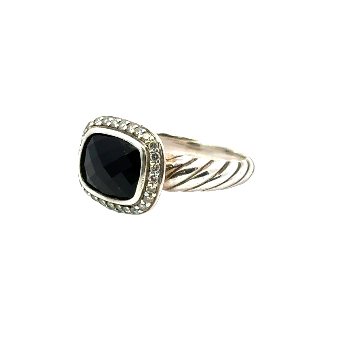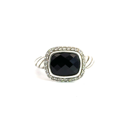 This David Yurman ring is crafted in sterling silver and features a cushion-cut, faceted black onyx gemstone as its centerpiece, bezel-set for a bold and elegant look. Surrounding the onyx is a halo of pavé diamonds, adding a touch of brilliance and contrast to the dark stone. The band showcases Yurman’s signature cable twist design, lending the piece a distinctive and recognizable style. With its raised setting and combination of textures and tones, this ring embodies the refined yet modern aesthetic that defines David Yurman’s iconic jewelry.