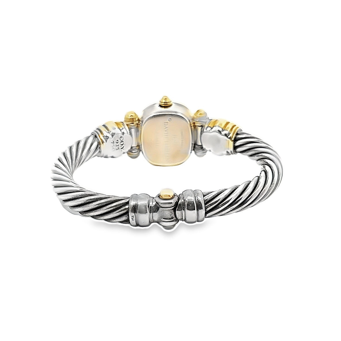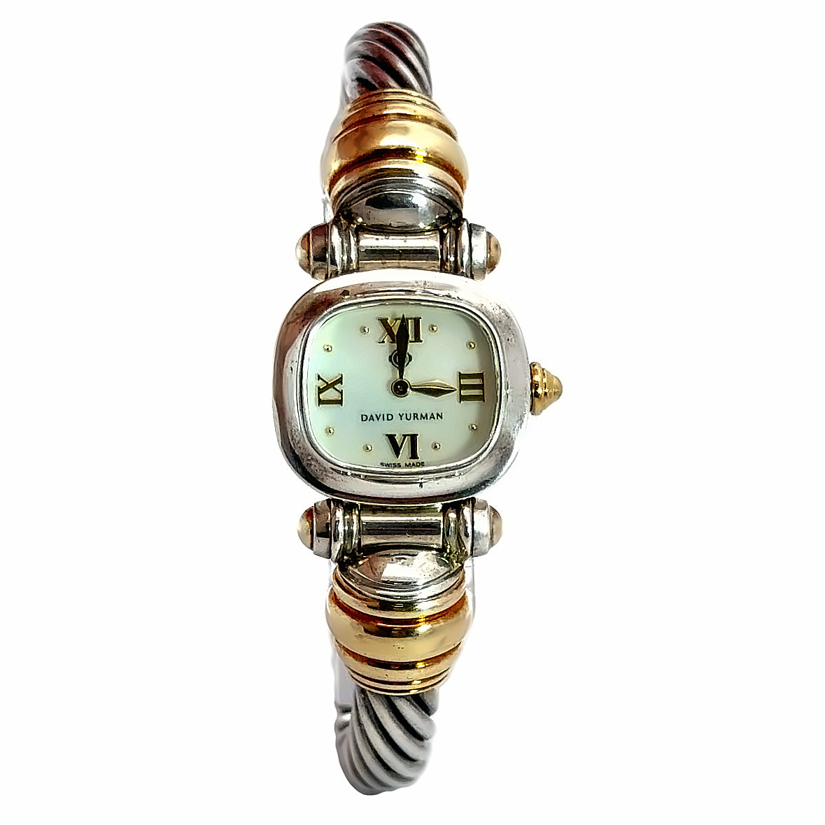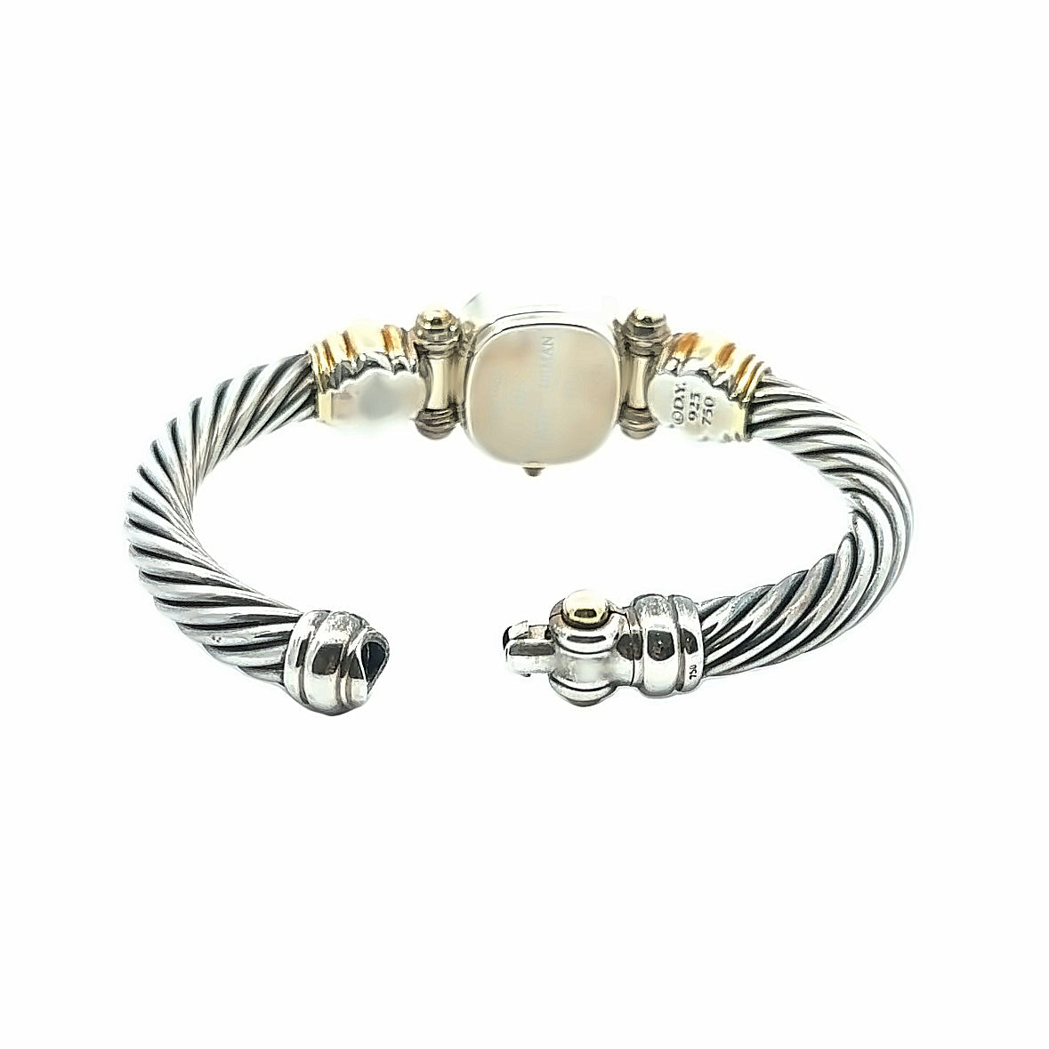 When fine jewelry meets Swiss craftsmanship you get a David Yurman cable watch. This fine timepiece has a Mother of Pearl Dial, 14K yellow gold details, and a sterling silver bracelet.