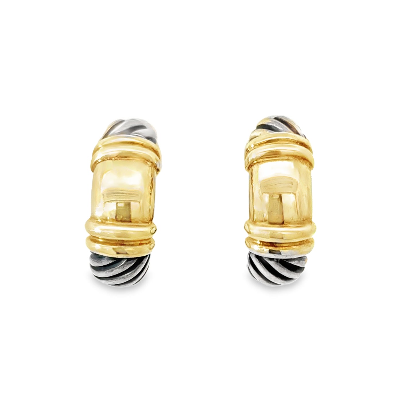 These David Yurman half-hoop earrings are a stunning blend of sterling silver (925) and 14K yellow gold (585), showcasing the brand’s signature two-tone aesthetic. The design features a smooth, polished gold section that contrasts beautifully with the iconic twisted cable detailing in oxidized sterling silver. The earrings are secured with a French-clip closure, ensuring both comfort and elegance. These versatile earrings exude timeless sophistication, making them the perfect accessory for both everyday wear and special occasions.