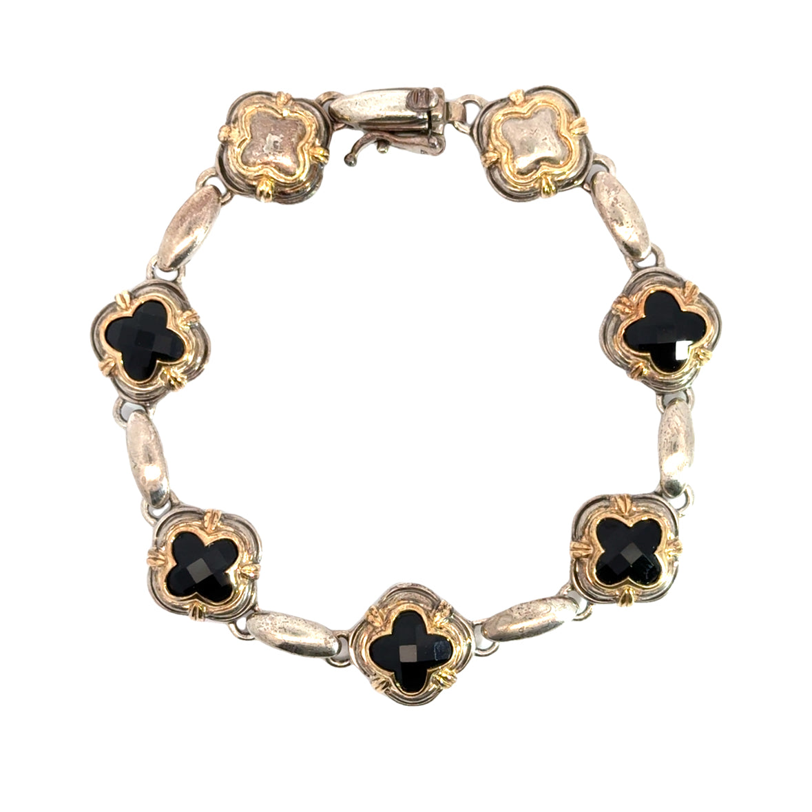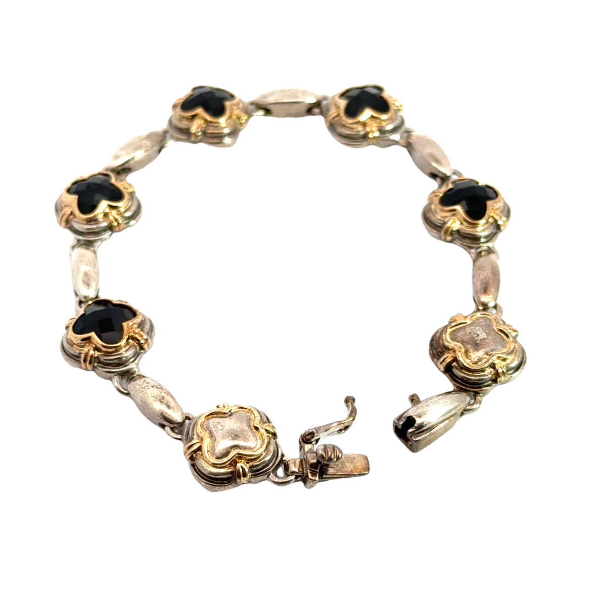 This Lagos bracelet is a beautifully crafted piece combining sterling silver (925) and 18K yellow gold. It features a series of clover-shaped links, some adorned with faceted black onyx stones, while others are elegantly detailed with gold accents. The intricate metalwork and contrast between the dark gemstones and warm gold embellishments create a sophisticated and timeless design. Secured with a sturdy clasp, this bracelet is both stylish and versatile, making it a stunning addition to any jewelry collection.