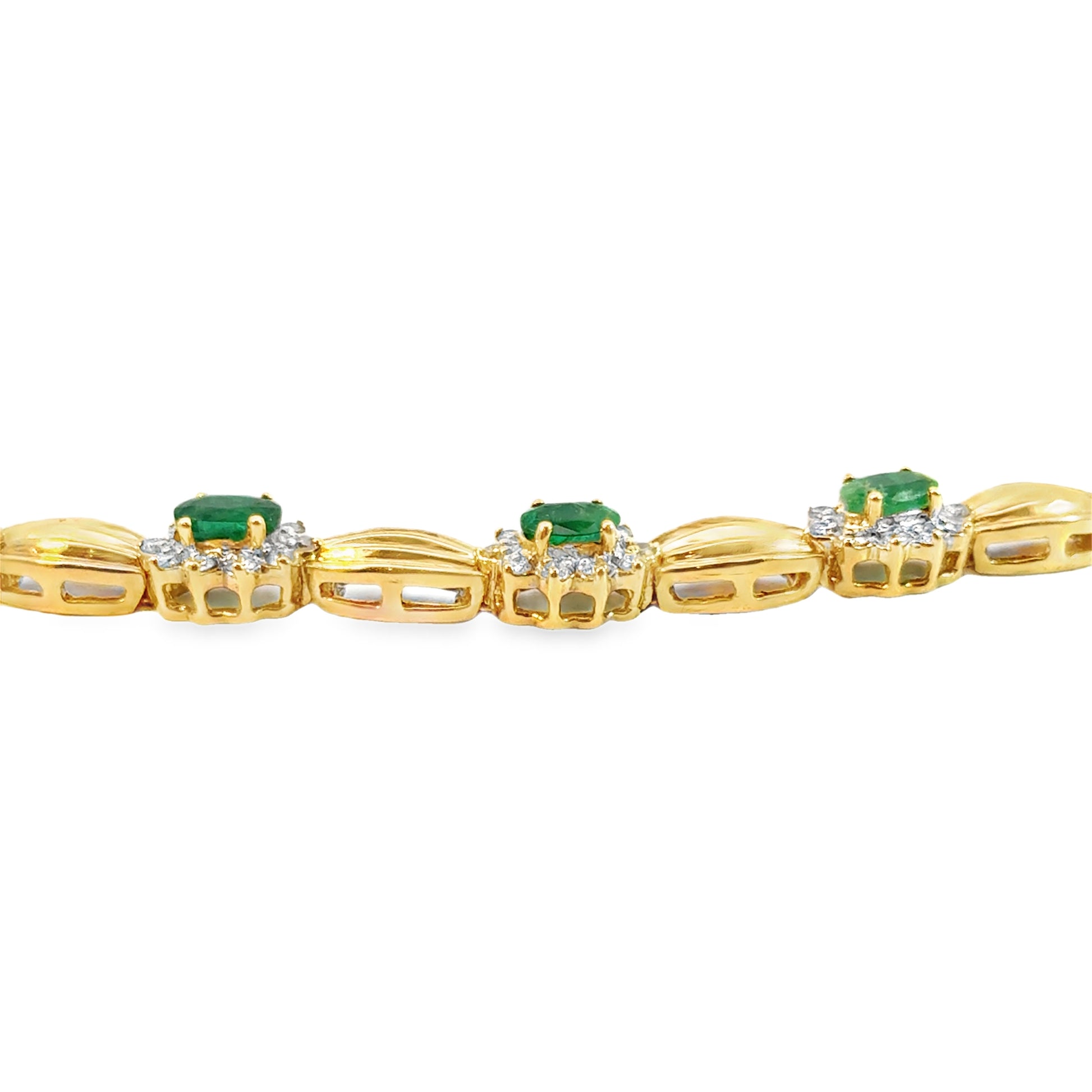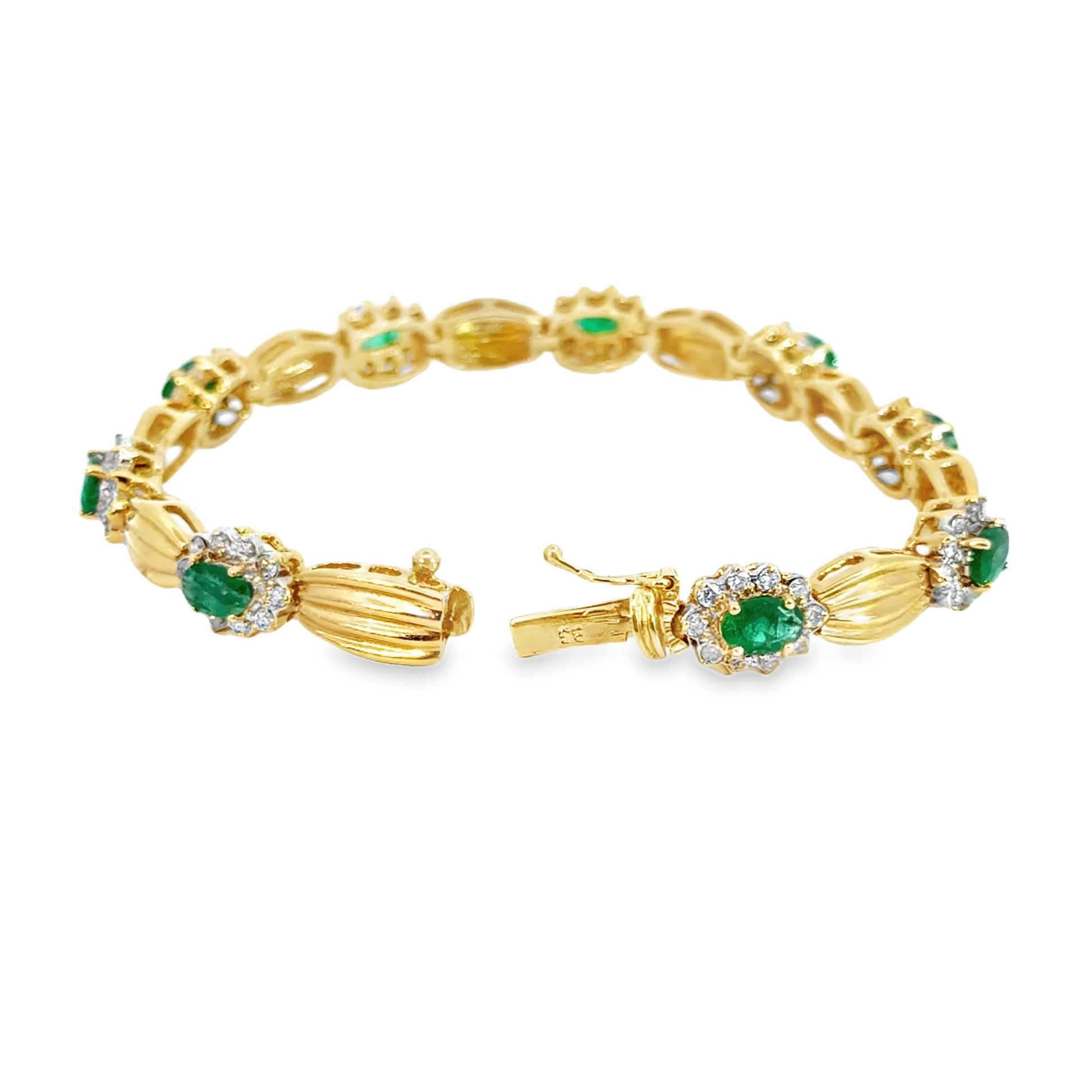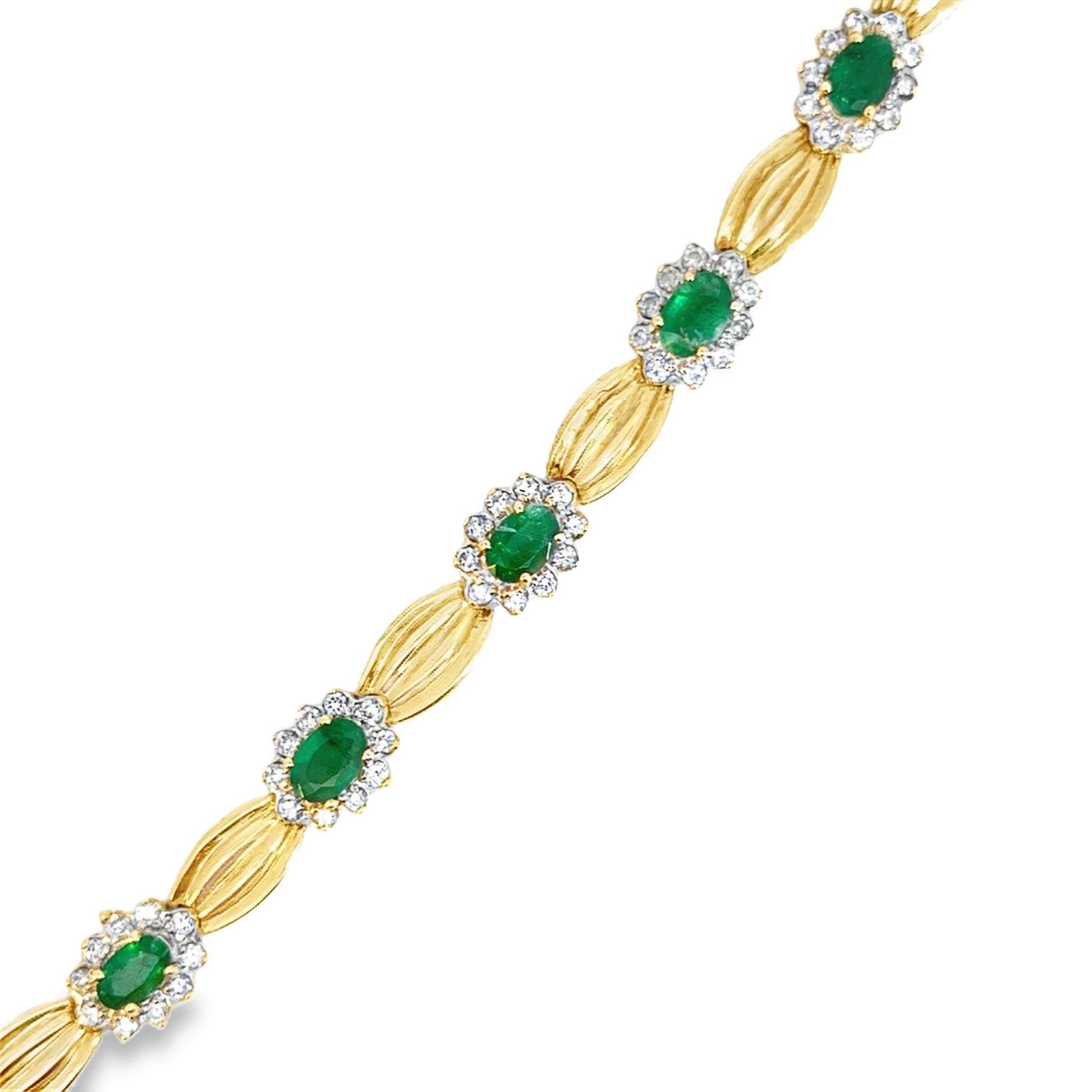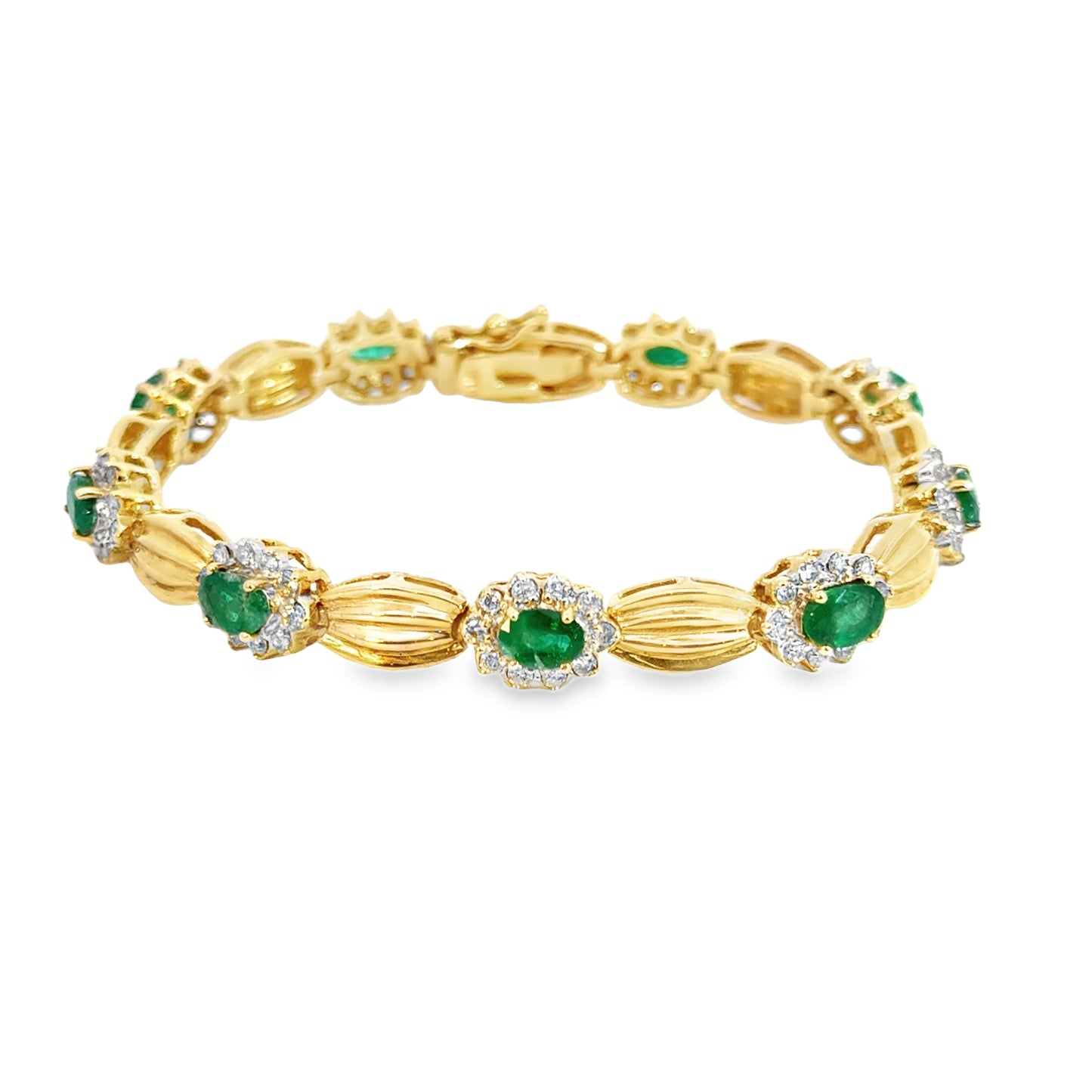 This exquisite 14K yellow gold bracelet is a timeless piece of fine jewelry, featuring vibrant oval-cut emeralds and sparkling diamonds. Each emerald is elegantly encircled by a halo of round-cut diamonds, enhancing the rich green hue with a brilliant contrast. The alternating gold links have a sculpted, ribbed design, adding texture and depth to the bracelet’s luxurious aesthetic.