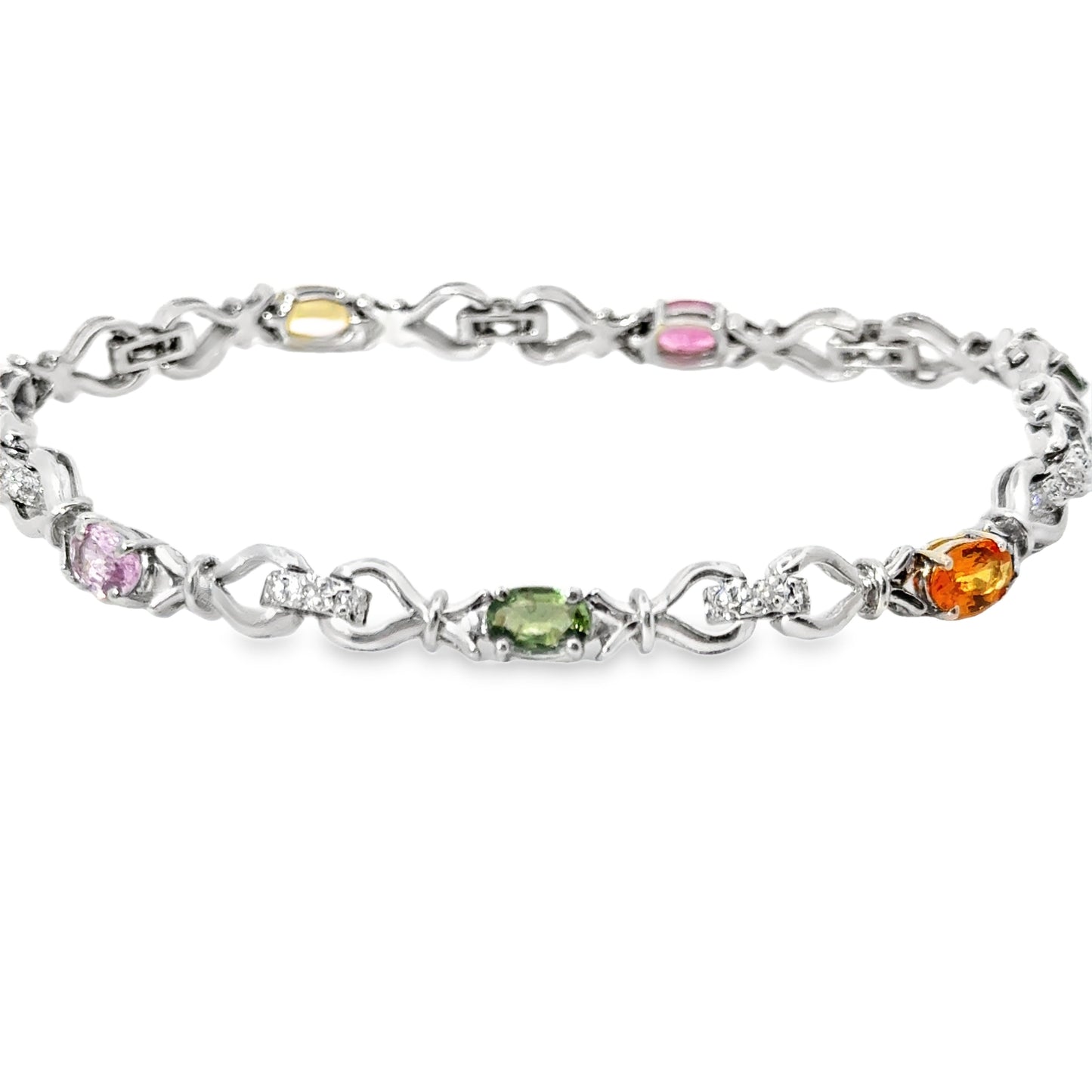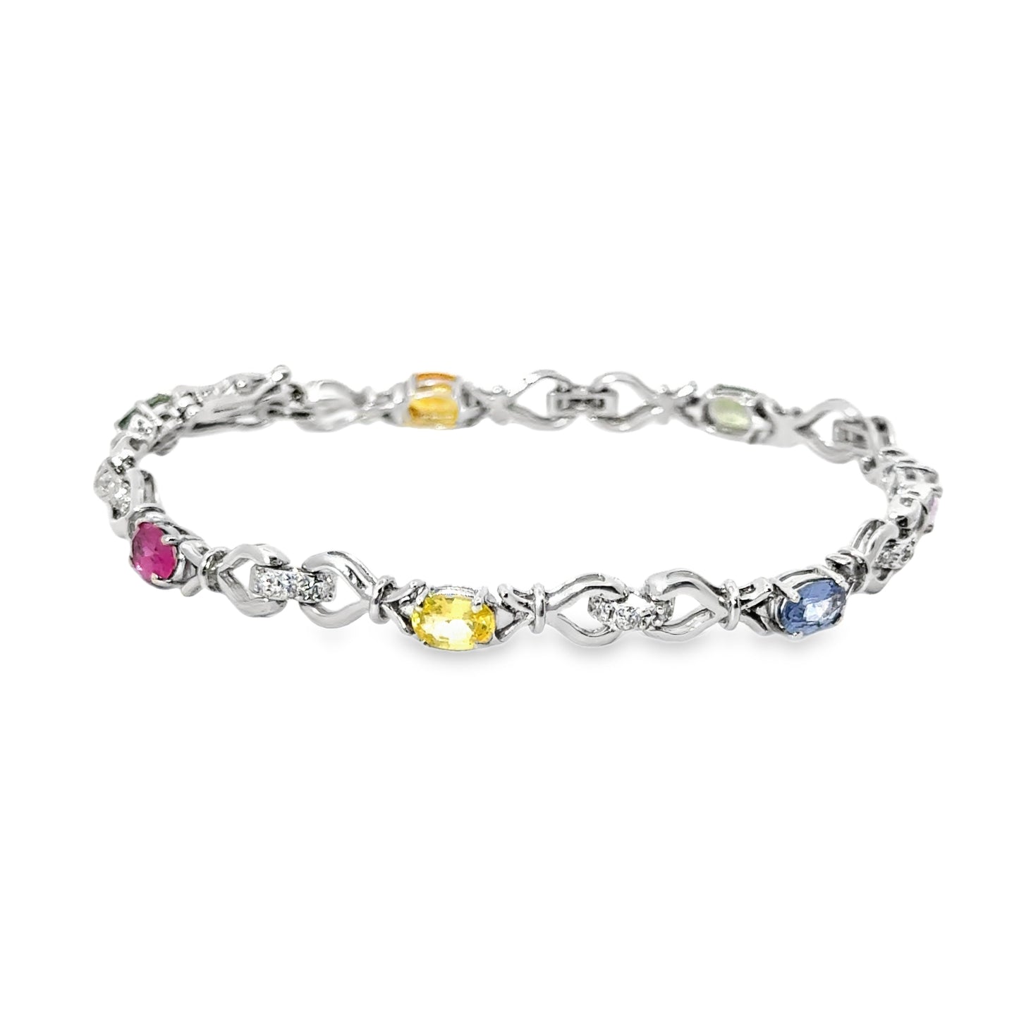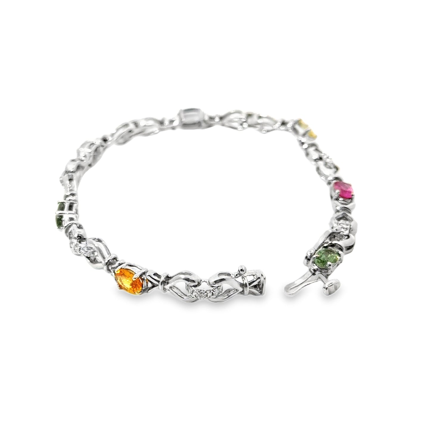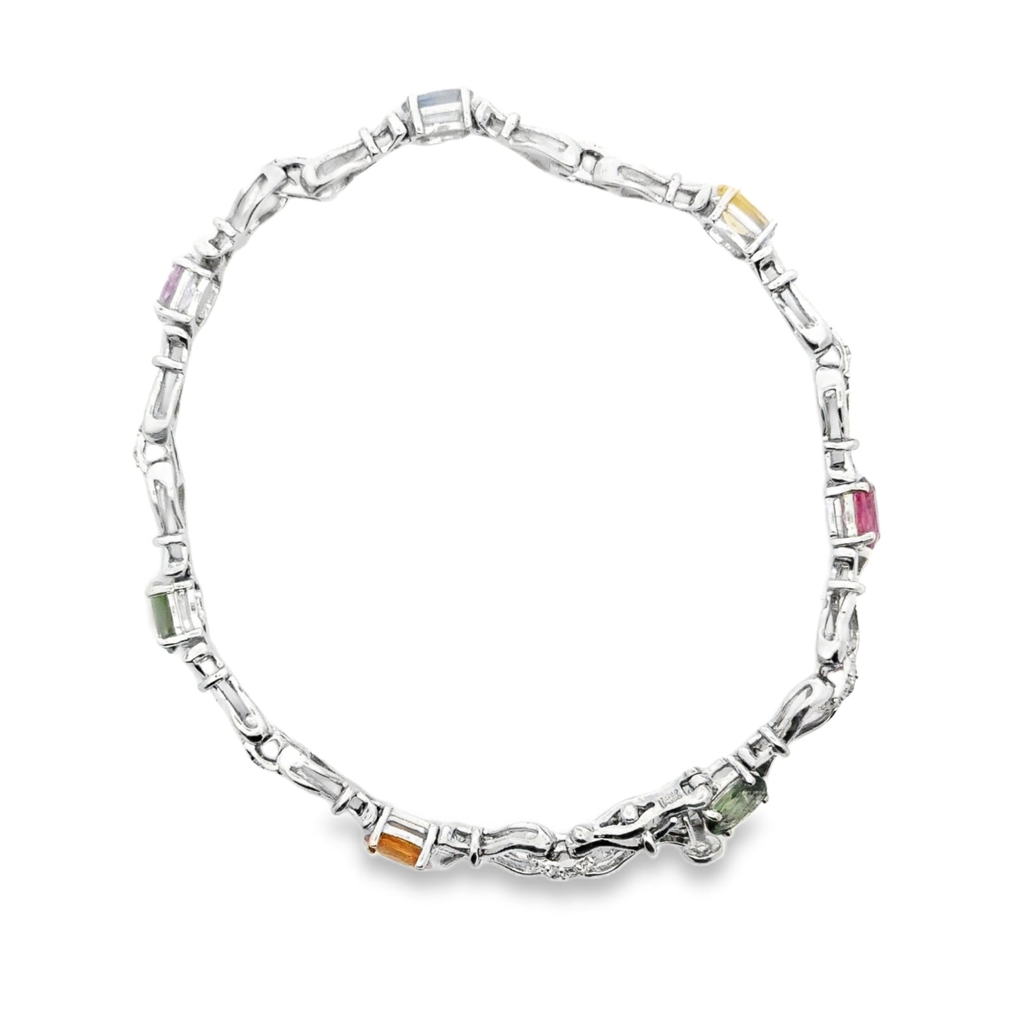 This elegant 14k white gold bracelet is adorned with a vibrant array of multi-colored gemstones and sparkling diamonds. Each gemstone is carefully set in individual sections, showcasing a spectrum of colors including pink, yellow, green, blue, and orange. These colorful stones are interspersed with delicate diamond accents, adding a luxurious shimmer to the piece. The intricate link design adds a graceful flow to the bracelet, allowing it to sit comfortably on the wrist while offering a striking visual appeal. This bracelet is both a statement piece and a timeless accessory, perfect for those who love a pop of color combined with classic diamond elegance.