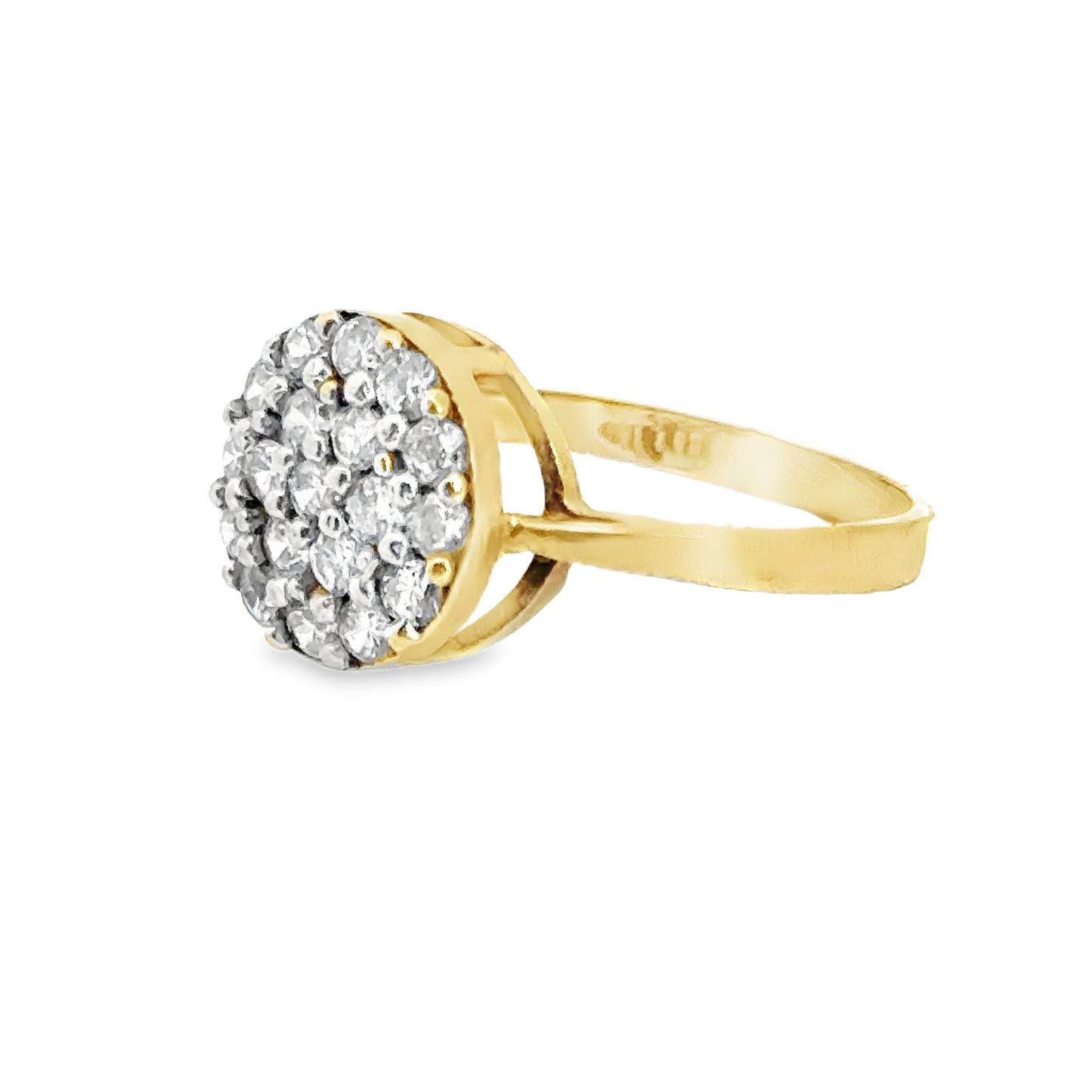 This yellow gold ring features a stunning cluster of diamonds arranged in a circular design, giving it a unique sparkle that stands out. The diamonds are tightly set, reflecting light from all angles, adding an extra layer of brilliance to the piece. The simple yet elegant shank highlights the diamond cluster, allowing it to take center stage. The ring is both playful and sophisticated, making it a perfect choice for those looking to add something special to their collection, whether for daily wear or a glamorous occasion.
