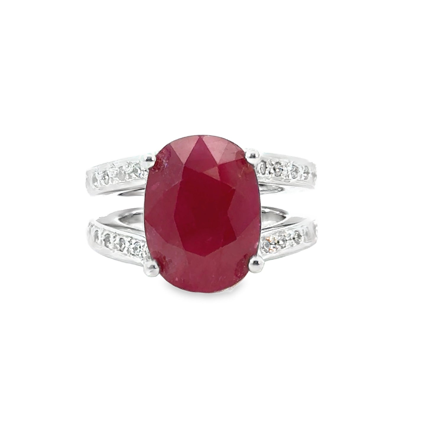 This exquisite ring is crafted in 14K white gold and features a stunning, large oval-cut ruby at its center. The vibrant red of the ruby is beautifully complemented by a split-shank band adorned with rows of sparkling diamonds. The diamonds add a delicate shimmer that enhances the luxurious appearance of the ring without overwhelming the bold color of the ruby. The split-shank design creates an open and airy feel, giving the ring a modern, elegant style. This piece is perfect for those who appreciate a blend of classic beauty and contemporary design, with the ruby as the captivating focal point.