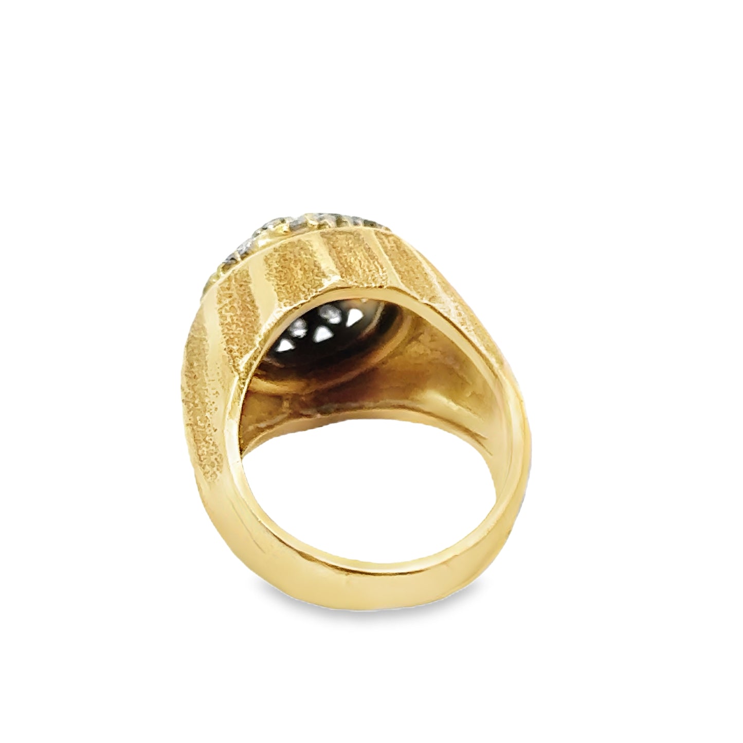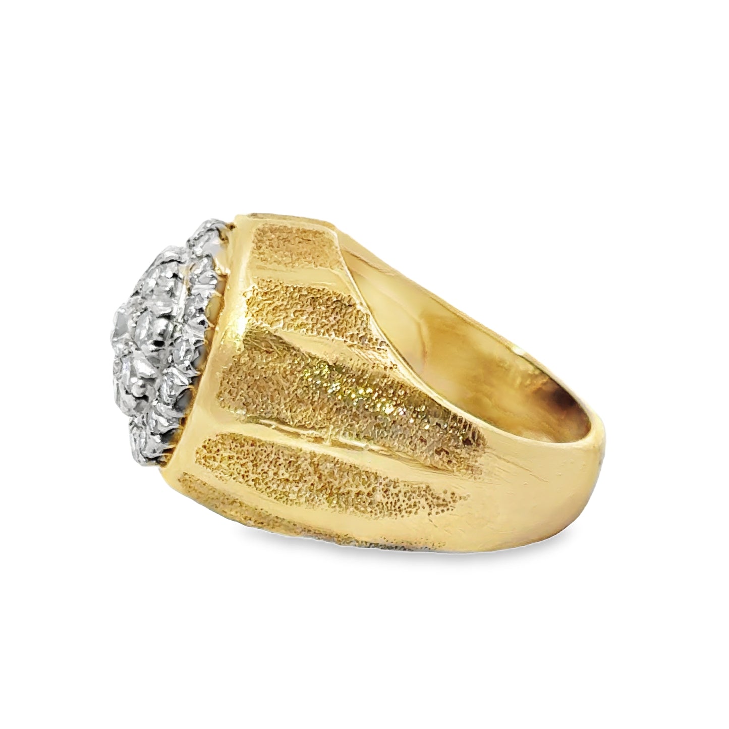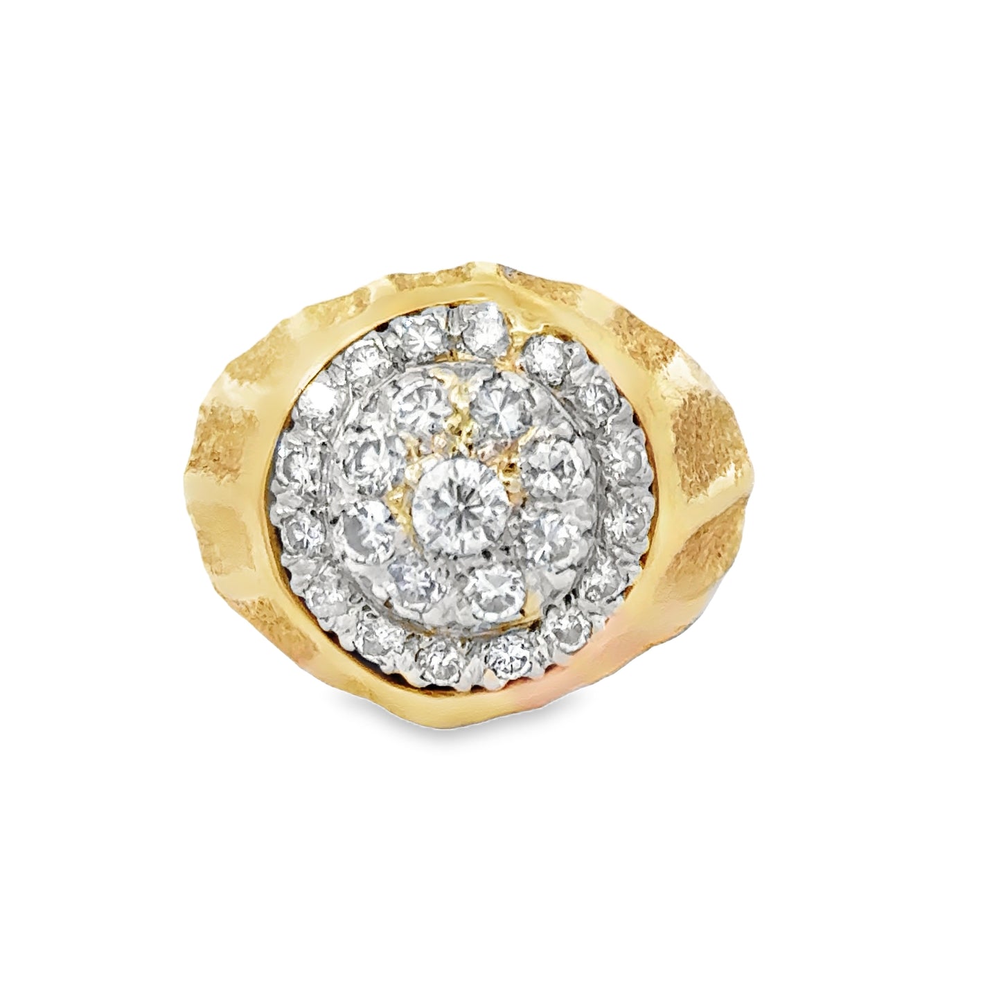 This bold and extravagant statement ring is designed to capture attention with its modern flair. Crafted in 14K yellow gold, it features an impressive 1.50-carat diamond centerpiece with intense sparkle. The band, with its graduated and textured design, adds depth and character, enhancing the ring’s luxurious appeal. The combination of the rich gold setting and the brilliant diamonds makes this piece an ideal choice for someone looking to make a lasting impression, offering a perfect balance of modern design and opulence.