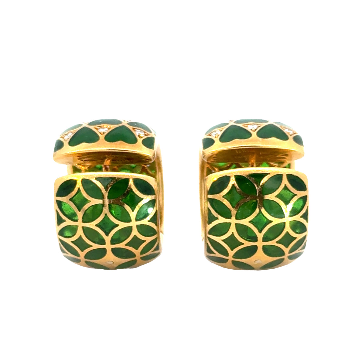 These striking vintage hoop earrings are finely crafted in 18K yellow gold and date to the 1950s, showcasing exceptional detail and artistry throughout. The exterior features a distinctive heart motif rendered in rich green enamel, accented with sparkling diamonds set within a geometric lattice. In contrast, the reverse reveals a beautifully executed openwork pattern, offering a different yet equally captivating design—an elegant detail visible from every angle.