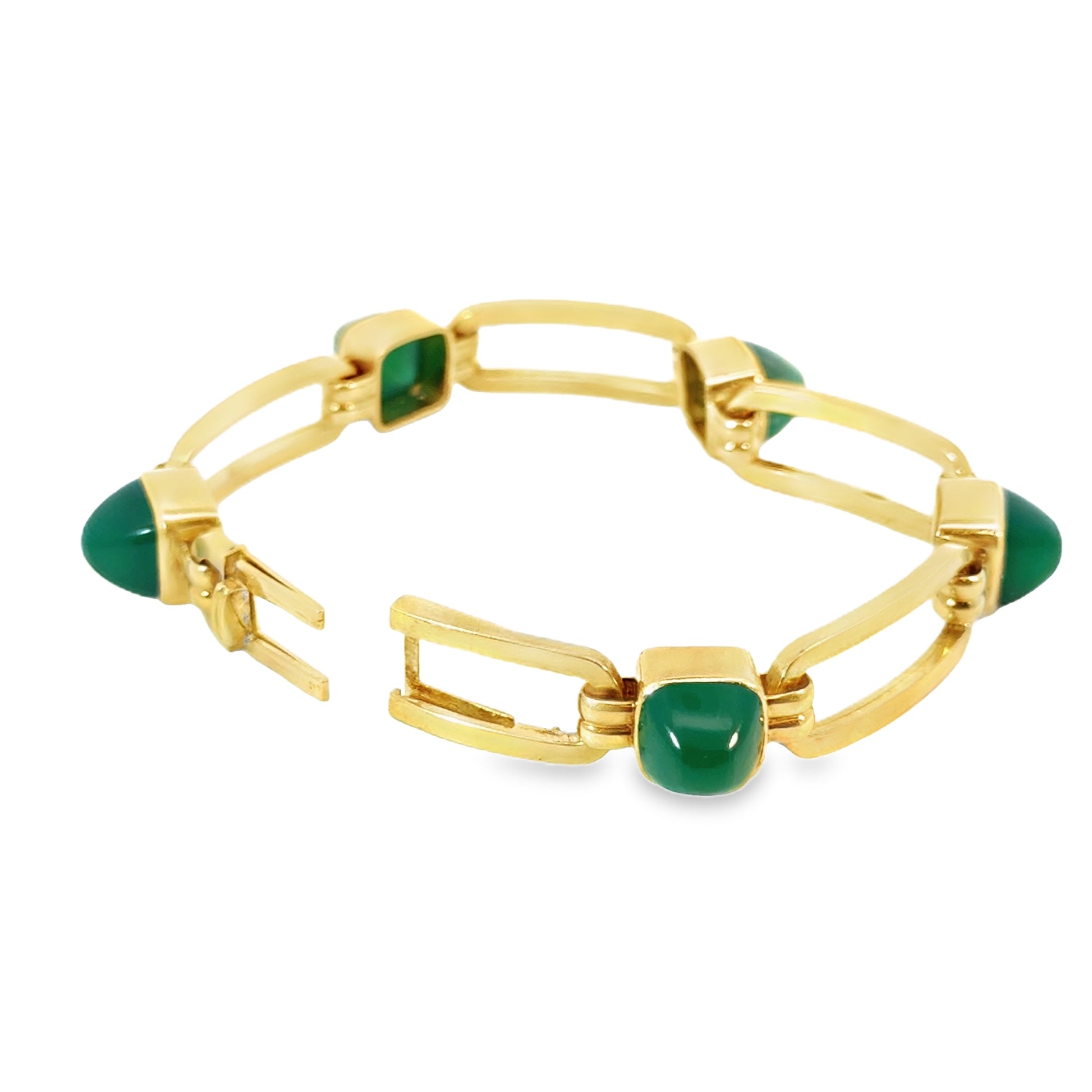 This vintage 18k yellow gold bracelet is an exquisite piece that seamlessly blends timeless elegance with bold design. Featuring vibrant green jade cabochons, each stone is bezel-set within sleek gold links, creating a striking contrast between the rich, warm gold and the deep green hue of the jade.