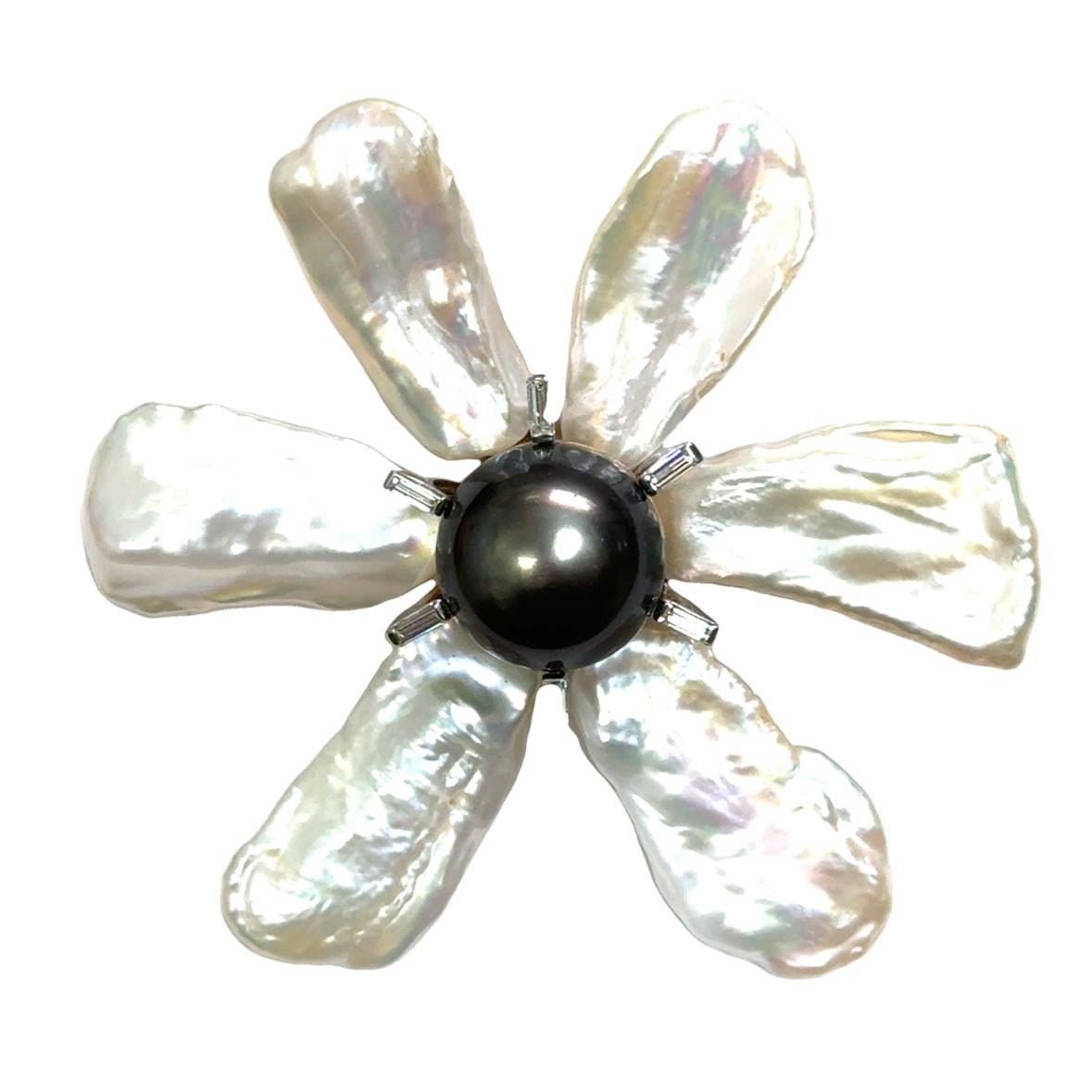 Luxurious 18K Yellow Gold Black & Natural Keshi Pearl & Diamond Brooch