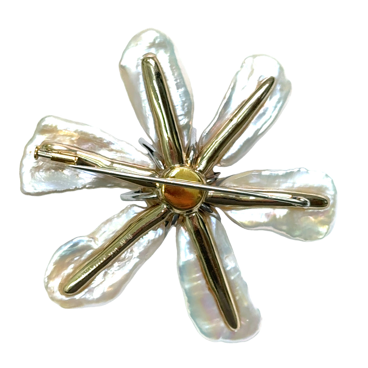 This exquisite brooch by C. Wallin is a testament to artistry and luxury, crafted from 18k yellow gold. Its standout feature is the striking contrast between the lustrous black pearl at the center and the petal-like arrangement of organic Keshi pearls, which radiate a unique and natural iridescence. The petals, with their textured, irregular shapes, create a soft yet bold floral motif.