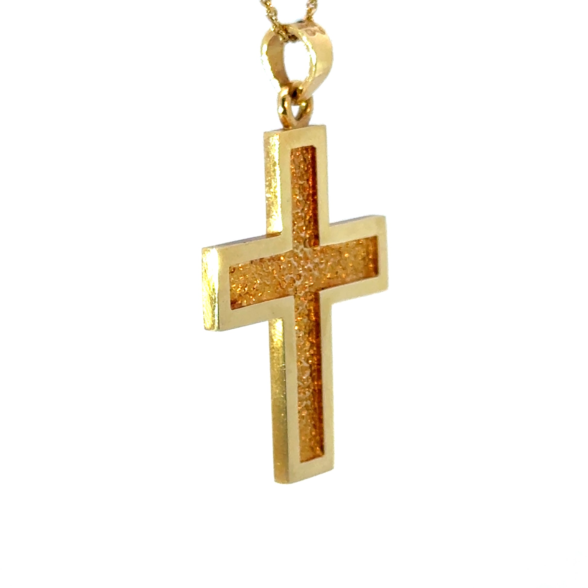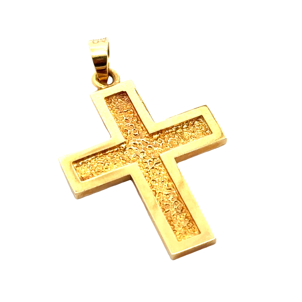 This vintage estate cross pendant is crafted in solid 18k yellow gold, featuring a beautifully balanced design with a rich polished border framing a hammered textured center. The contrast between the high-shine finish and the subtle texture adds depth and character, making it a timeless piece of style. A sturdy bail allows for easy wear on your favorite chain. Classic and substantial, this cross pendant is a meaningful addition to any jewelry collection. Stamped and tested for 18k gold.