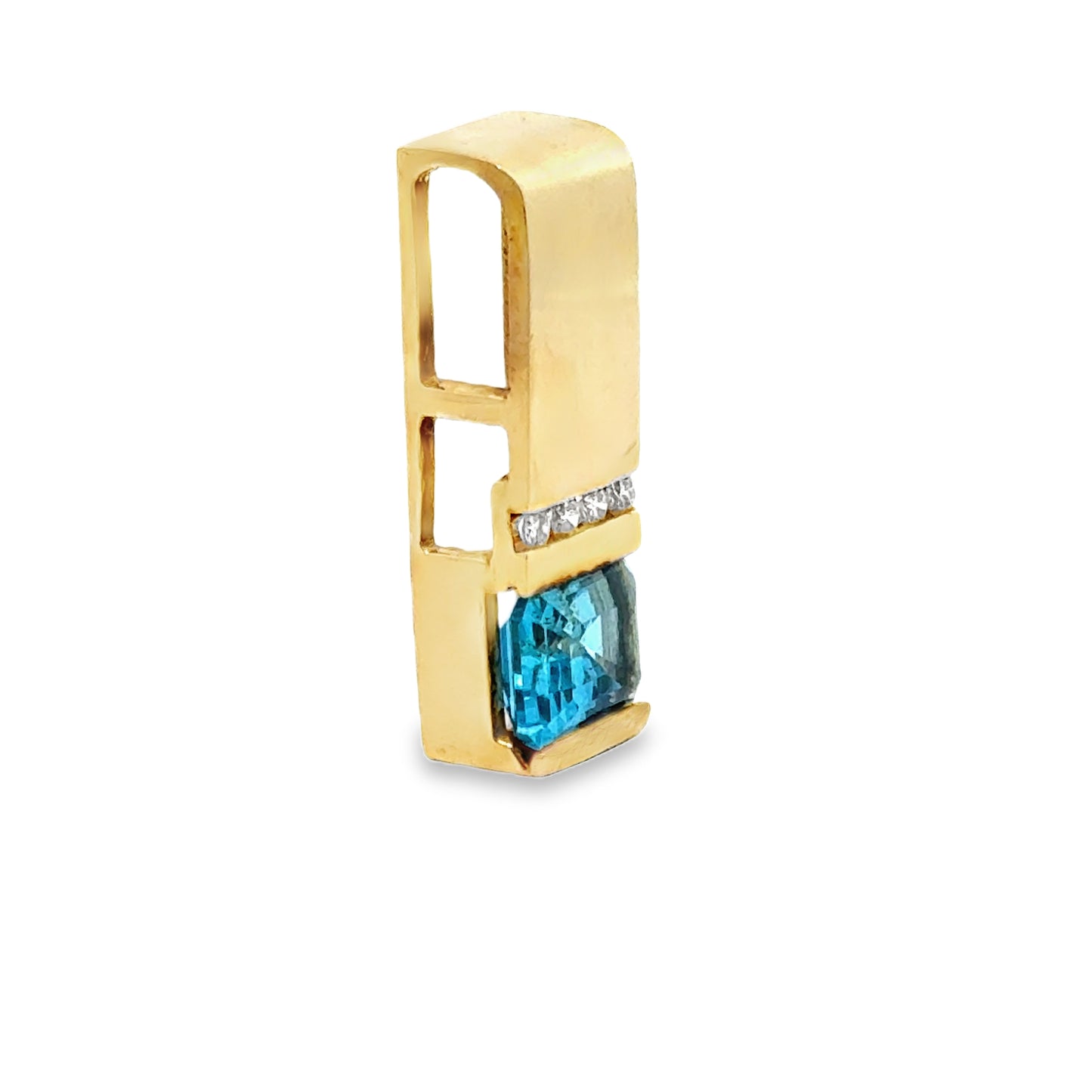 This elegant 14K yellow gold pendant showcases a striking combination of blue topaz and diamonds. The design is sleek and modern, with a rectangular structure that emphasizes the beauty of the gemstones. A brilliant emerald-cut blue topaz sits at the bottom of the pendant, radiating a vibrant, oceanic hue that catches the light beautifully. Above the topaz, a row of sparkling diamonds adds a touch of brilliance and contrast, creating a seamless transition from the gold to the blue stone.