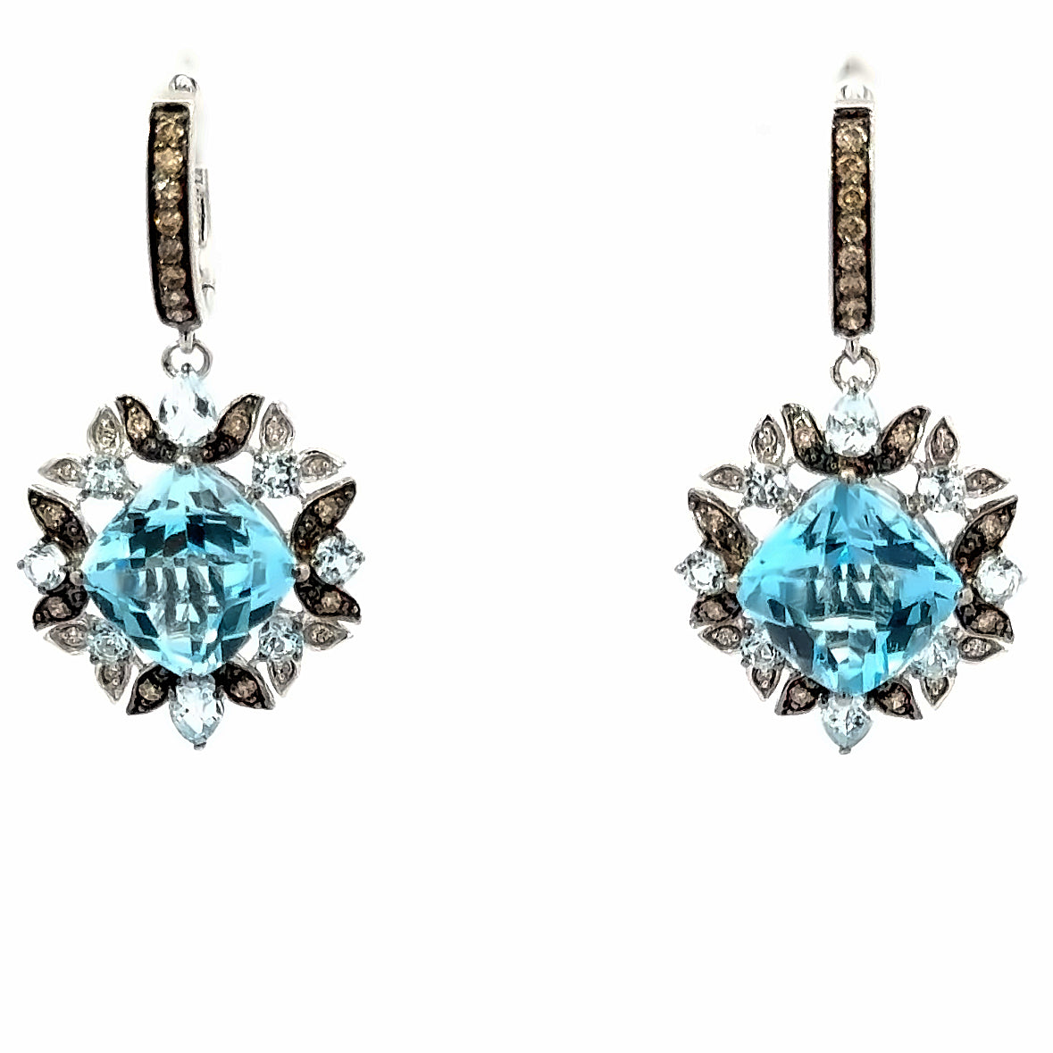 Stunning Le Vian white gold aquamarine and diamond earrings. The mesmerizing aquamarine center stones are encased in a leaf halo of lucious chocolate and white diamonds, creating an amazing contrast that will catch every eye.
