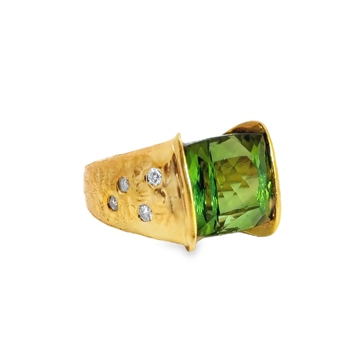 Estate 18K Hammered Yellow Gold Large Green Tourmaline & Diamond Cocktail Ring