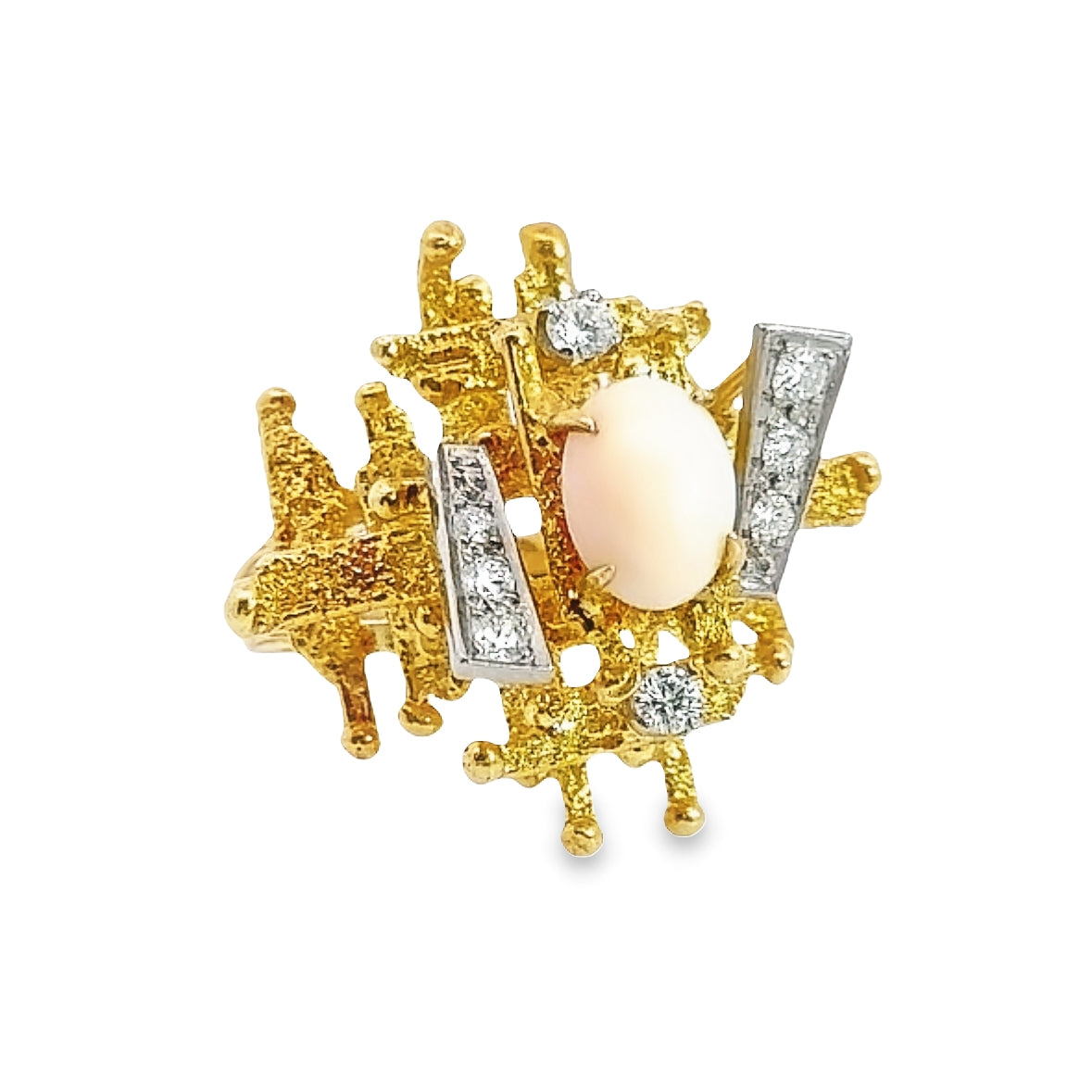 Introducing an fascinating estate custom 18K yellow and white gold oval coral and diamond accent ring - a true masterpiece of modern design! This ring effortlessly blends the elegance of tradition with a contemporary twist and with its undeniable allure will captivate any onlooker.