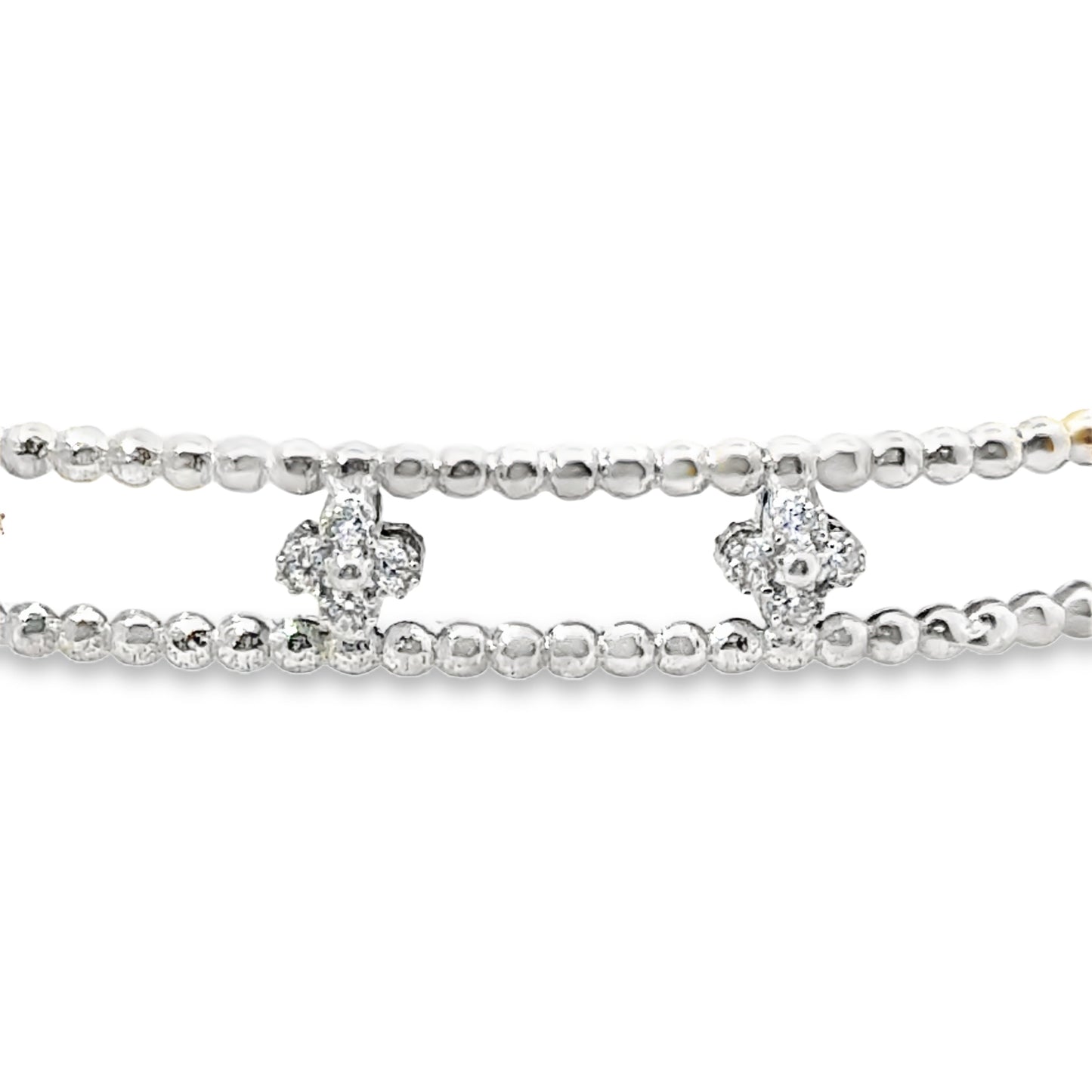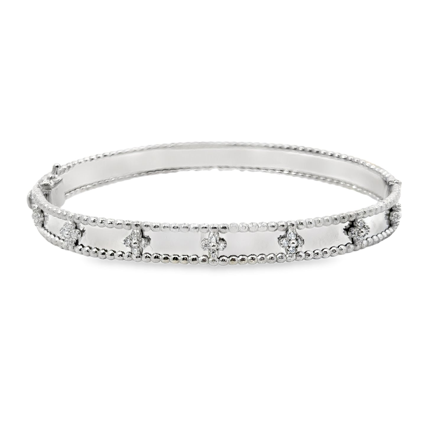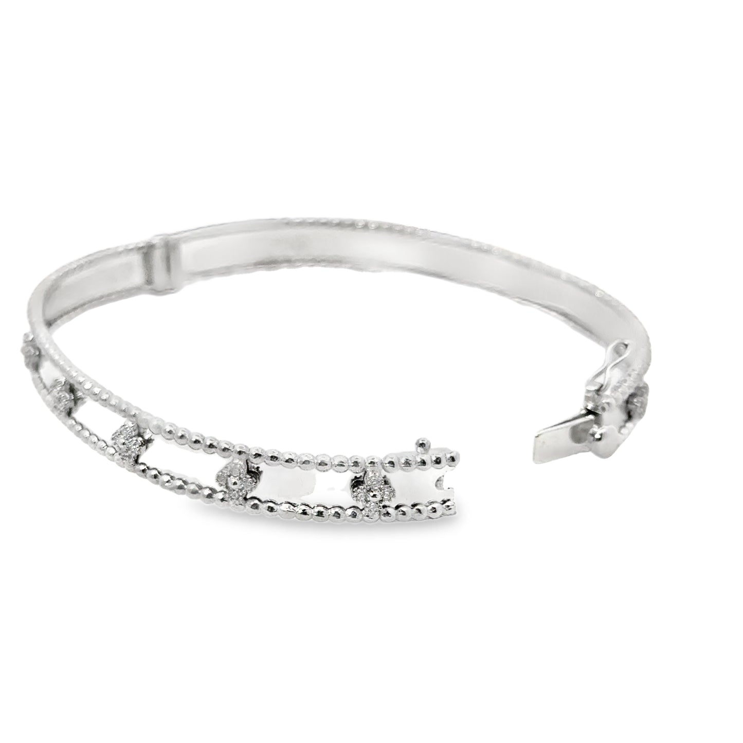Delicate and elegant 18K white gold clover-patterned hinged bangle. The piece features a series of small, intricately designed cubic zirconia encrusted clovers set along the bracelet’s outer surface. These clovers are bordered by a bead-like texture that runs along the top and bottom edges of the bangle, adding a touch of charm and dimension to the design.