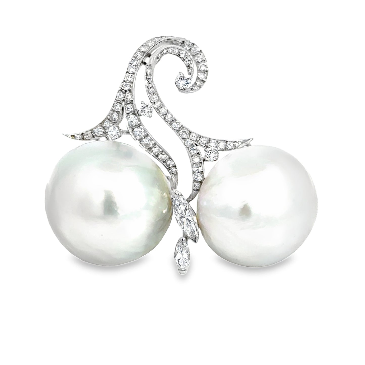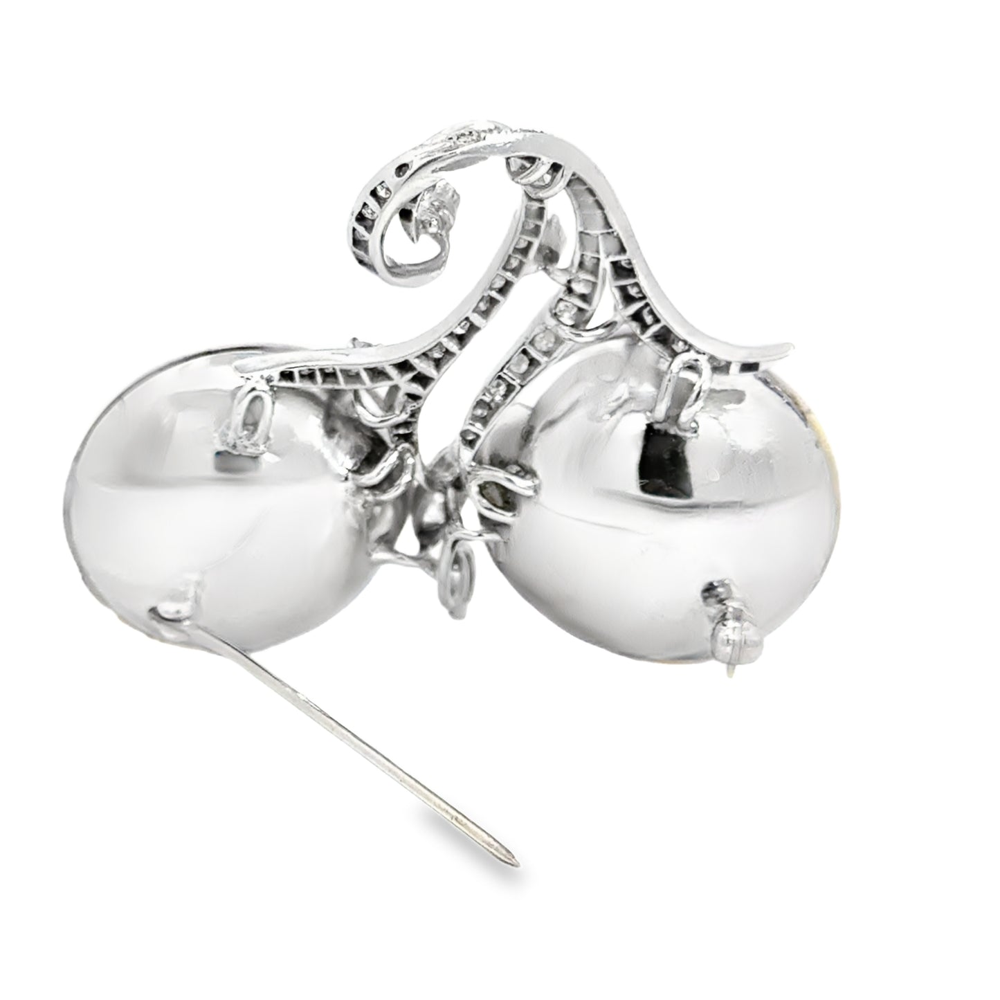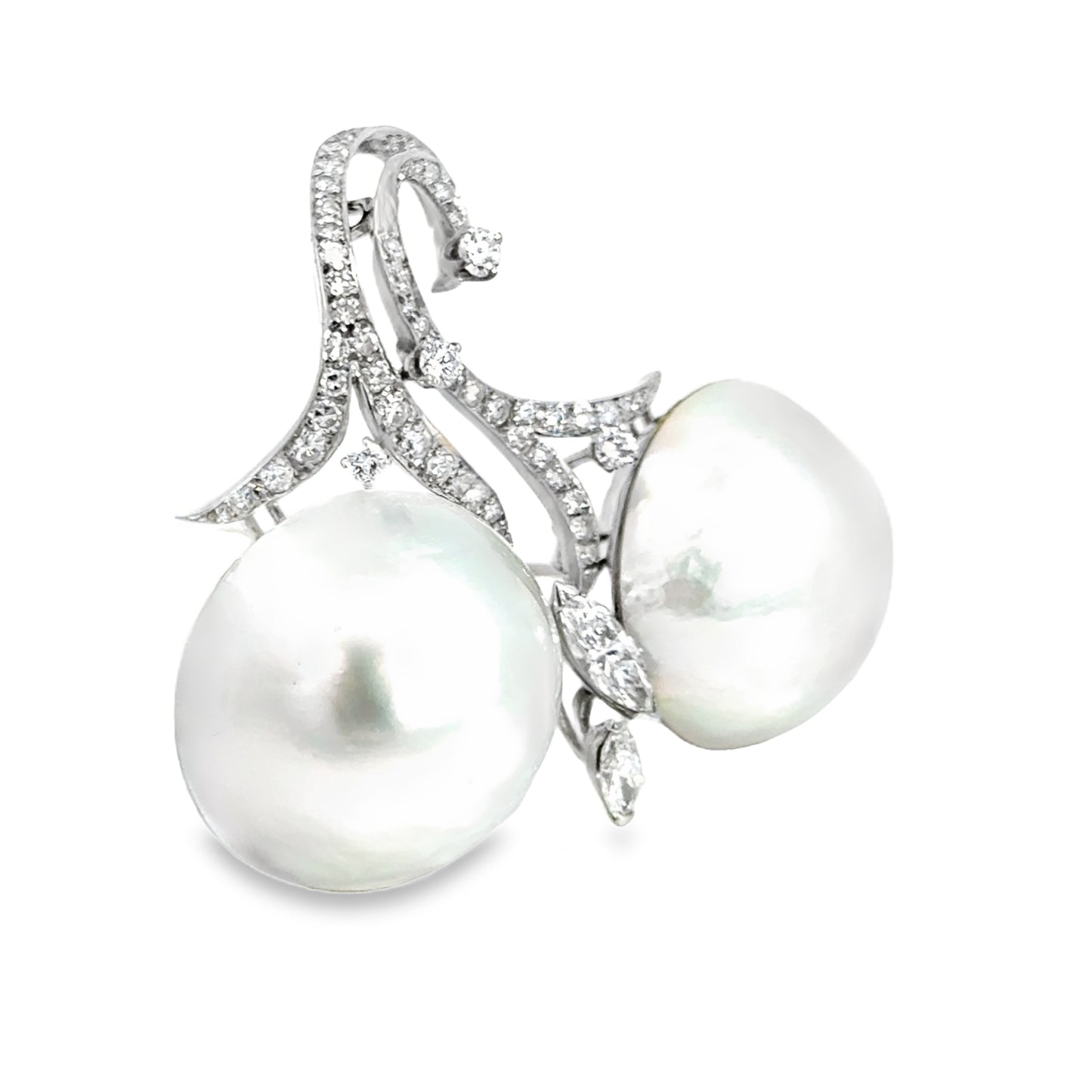 This is an exquisite platinum brooch featuring two large, luminous mother-of-pearl elements as the focal point. The brooch is intricately adorned with a flowing design of pavé-set diamonds that form an elegant, curving motif. The diamond accents are arranged in a delicate swirl pattern, adding a sense of movement and sophistication to the piece.