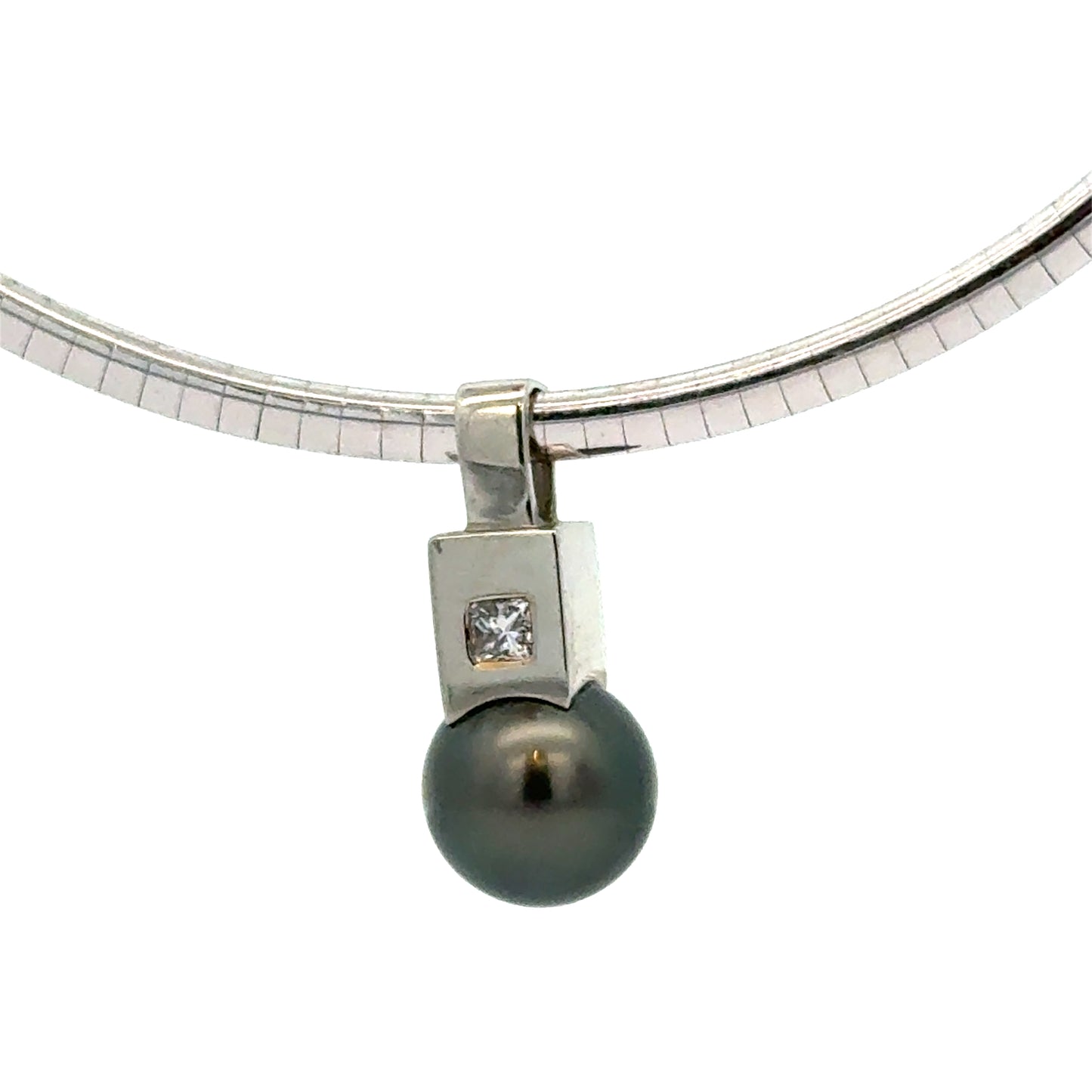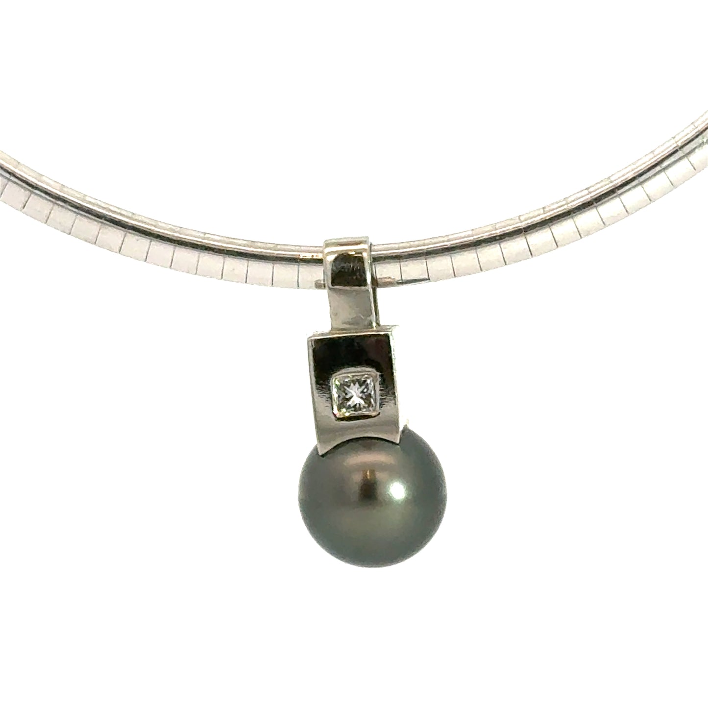 Elegant and timeless, this 18K white gold omega necklace features a striking pendant adorned with a lustrous black Tahitian pearl. Above the pearl sits a bezel-set princess cut diamond that adds a touch of modern sparkle to the design. The omega chain lies flat against the neckline for a sleek, contemporary look and is secured with a sturdy box clasp and safety latch. Sophisticated enough for formal occasions yet versatile for everyday luxury, this piece is a beautiful balance of classic and modern aesthetics. A stunning gift or heirloom-worthy addition to any fine jewelry collection.
